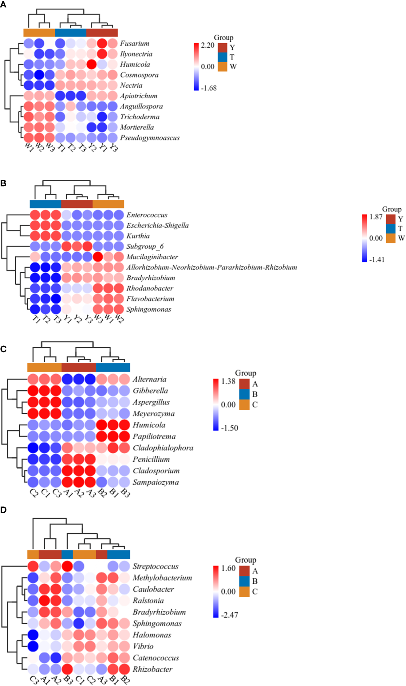 The number of species shared by the fungi communities in the surrounding soils of the nine groups of GeB seedlings from different propagation generations was 91. The number of endemic OTUs in each group was 431 (Y), 1,174 (T), and 536 (W). The endemic OTUs ranked as T>W>Y. Shared OTUs comprised 4.2% of the total OTUs. The number of species shared by the bacterial communities was 62. The number of endemic OTUs in each group was 4193 (Y), 1768 (T), and 7525 (W). The endemic OTUs were ranked W>Y>T. Shared bacterial OTUs accounted for 0.4% of the total OTUs (Figures 3A, B).