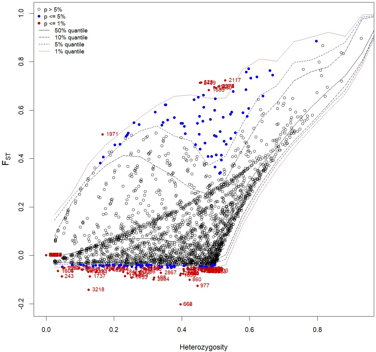Candidate loci under selection were identified using FST based outlier approach (Hierarchical structure model using Arlequin 3.5). FST: locus–specific genetic divergence among the populations; Heterozygosity: measure of heterozygosity per locus. Loci significant at the 1% level are indicated by red dots.