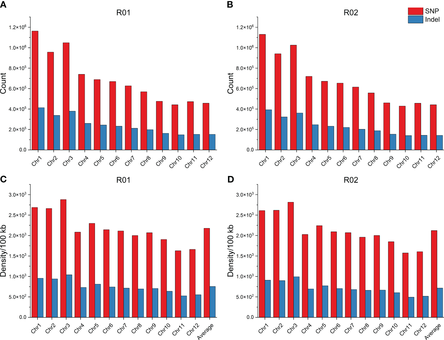 The distribution of variation density and variation number for SNPs and InDels on 12 chromosomes was investigated. The number of SNPs for R01 and R02 was equally distributed, with the highest number of SNPs on Chr1 and the least SNPs on Chr10. Similarly, Chr1 had the highest number of InDels, and Chr10 had the lowest number of InDels. The highest density of SNPs and InDels were found on Chr3, and the lowest were found on Chr11 in the R01 and R02. The average SNP densities were 2,177.35 SNPs/100 kb and 2,122.09 SNPs/100 kb, and the average InDel densities were 754.40 InDels/100 kb and 715.96 InDels/100 kb in R01 and R02, respectively (Figure 2).