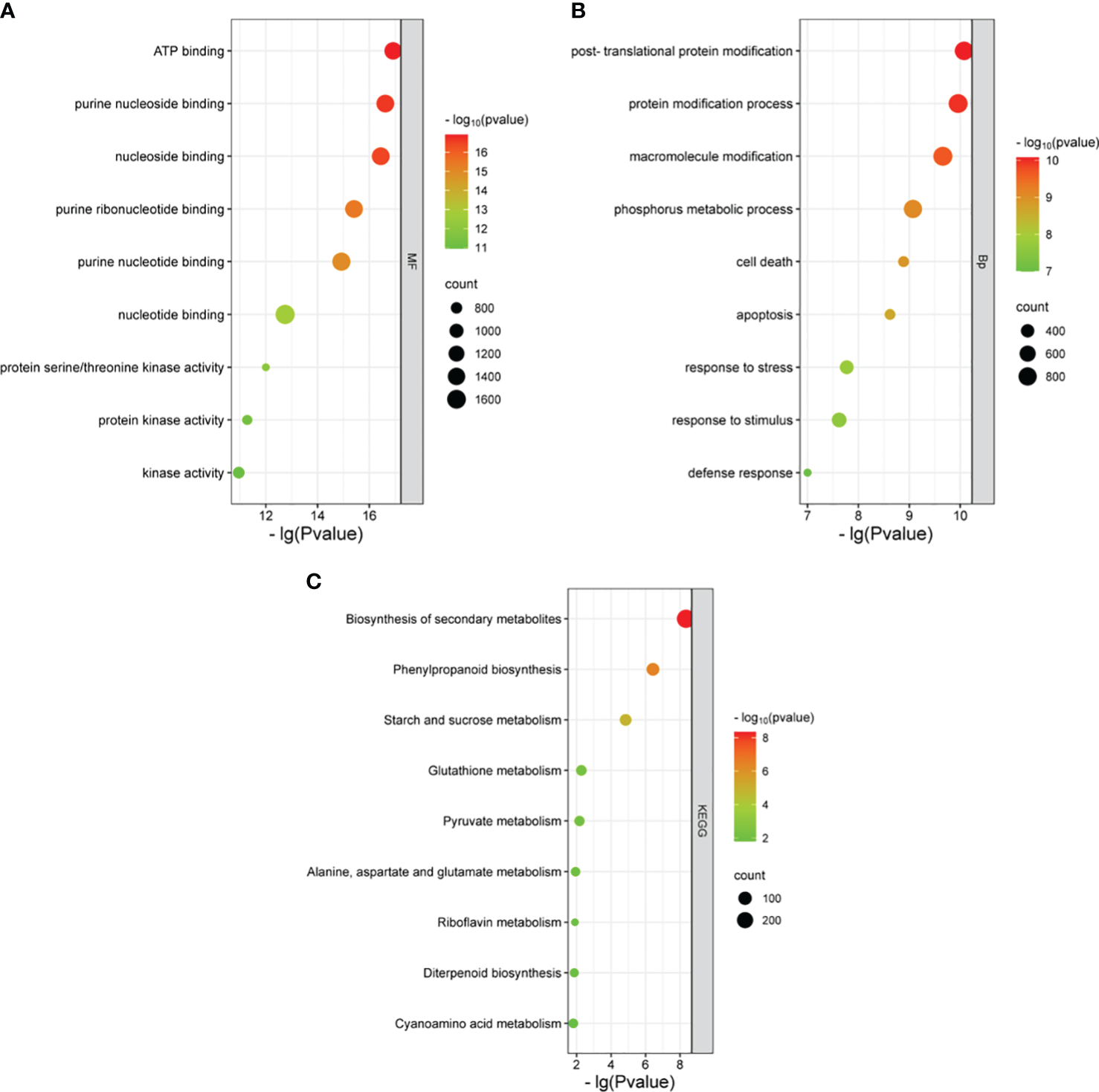 Large effect genomic variations (the variations annotated as HIGH and MODERATE by SnpEff software) were considered key variations. A total of 15,993 homozygous variant genes were detected for both R01 and R02 when compared with the Nipponbare reference genome, and GO enrichment analysis showed that these genes were enriched in four biological pathways (cell death, response to stress, macroscopic modification, and phosphorus metabolic process) and three molecular function pathways (ATP binding, protein serine/threonine kinase activity, and nucleoside binding). A total of 420 genes were enriched in response to stress, including 45 NBS-LRR type genes, which were also involved in cell death. Those NBS-LRR genes had 41,113,889 high-effect SNPs and 641,641 high-effect InDels. The KEGG analysis results showed that the 15,994 variant genes were enriched in metabolic pathways like biosynthesis of secondary metabolites, phenylpropanoid biosynthesis, and starch and sucrose metabolism (Figure 3).