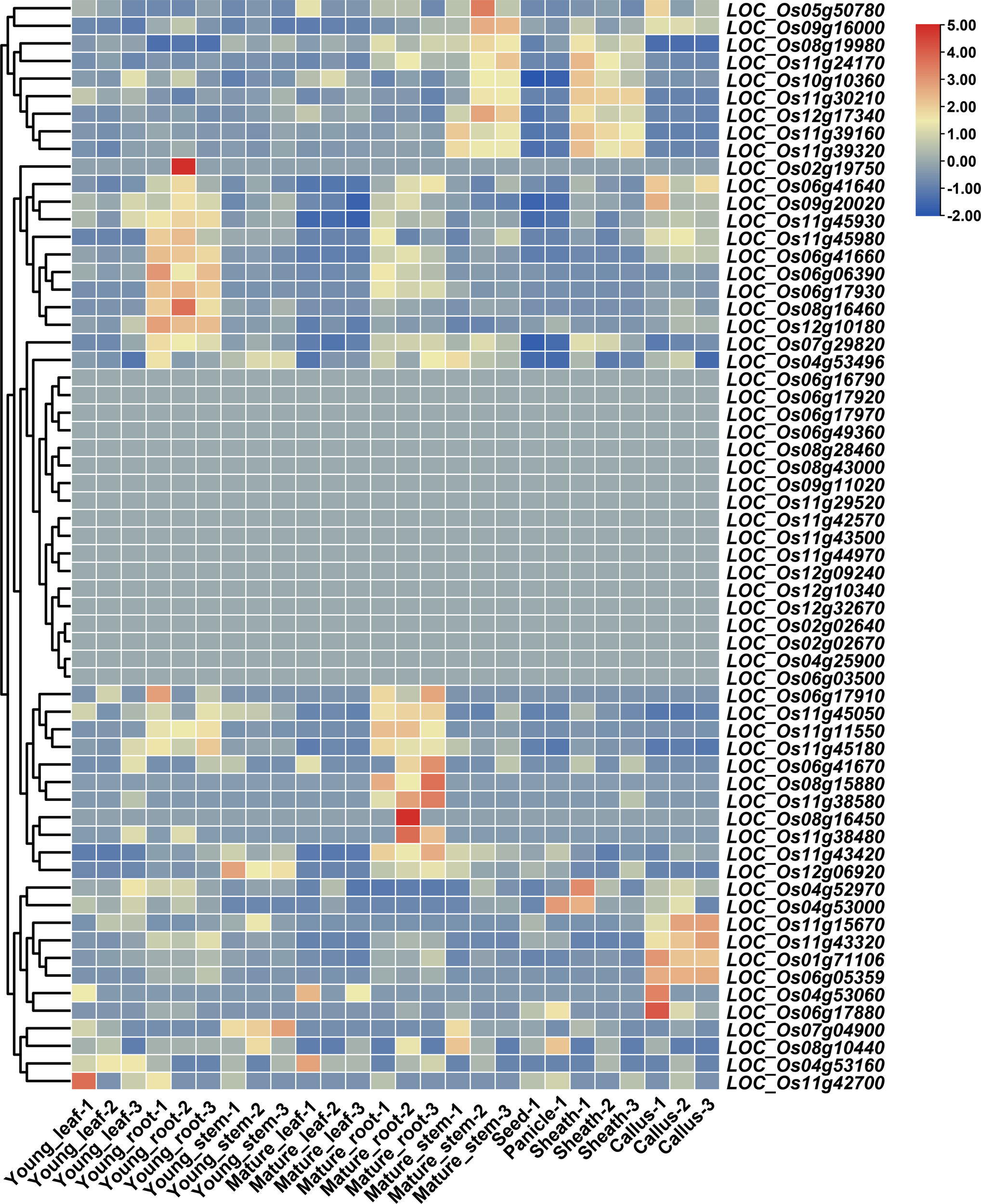 Gene expression patterns may provide insights into the functional characteristics of the genes. A total of 26 RNA sequencing samples, including three samples for young leaf, three samples for young root, three samples for young stem, three samples for mature leaf, three samples for mature root, three samples for mature stem, seed, and panicle, three samples for sheath, and three samples for callus, were used to explore the expression pattern of the 63 variant NBS-LRR genes. Eighteen variant genes were not expressed in those tissues, 11 genes (LOC_Os04g52970, LOC_Os04g53000, LOC_Os08g19980, LOC_Os11g24170, LOC_Os11g30210, LOC_Os10g10360, LOC_Os12g17340, LOC_Os11g39160, LOC_Os11g39320, LOC_Os05g50780, and LOC_Os09g16000) were mainly expressed in sheath and mature stem, and 26 genes (LOC_Os02g19750, LOC_Os11g43320, LOC_Os12g10180, LOC_Os08g16460, LOC_Os11g45980, LOC_Os06g41640, LOC_Os06g06390, LOC_Os06g41660, LOC_Os06g05359,LOC_Os06g17930, LOC_Os11g11550, LOC_Os04g53496, LOC_Os11g43420, LOC_Os12g06920, LOC_Os07g29820, LOC_Os09g20020, LOC_Os11g45930, LOC_Os06g17910, LOC_Os11g45050, LOC_Os01g71106, LOC_Os11g45180, LOC_Os08g16450, LOC_Os11g38480, LOC_Os06g41670, LOC_Os08g15880, and LOC_Os11g38580) were mainly expressed in young and mature root (Figure 4).