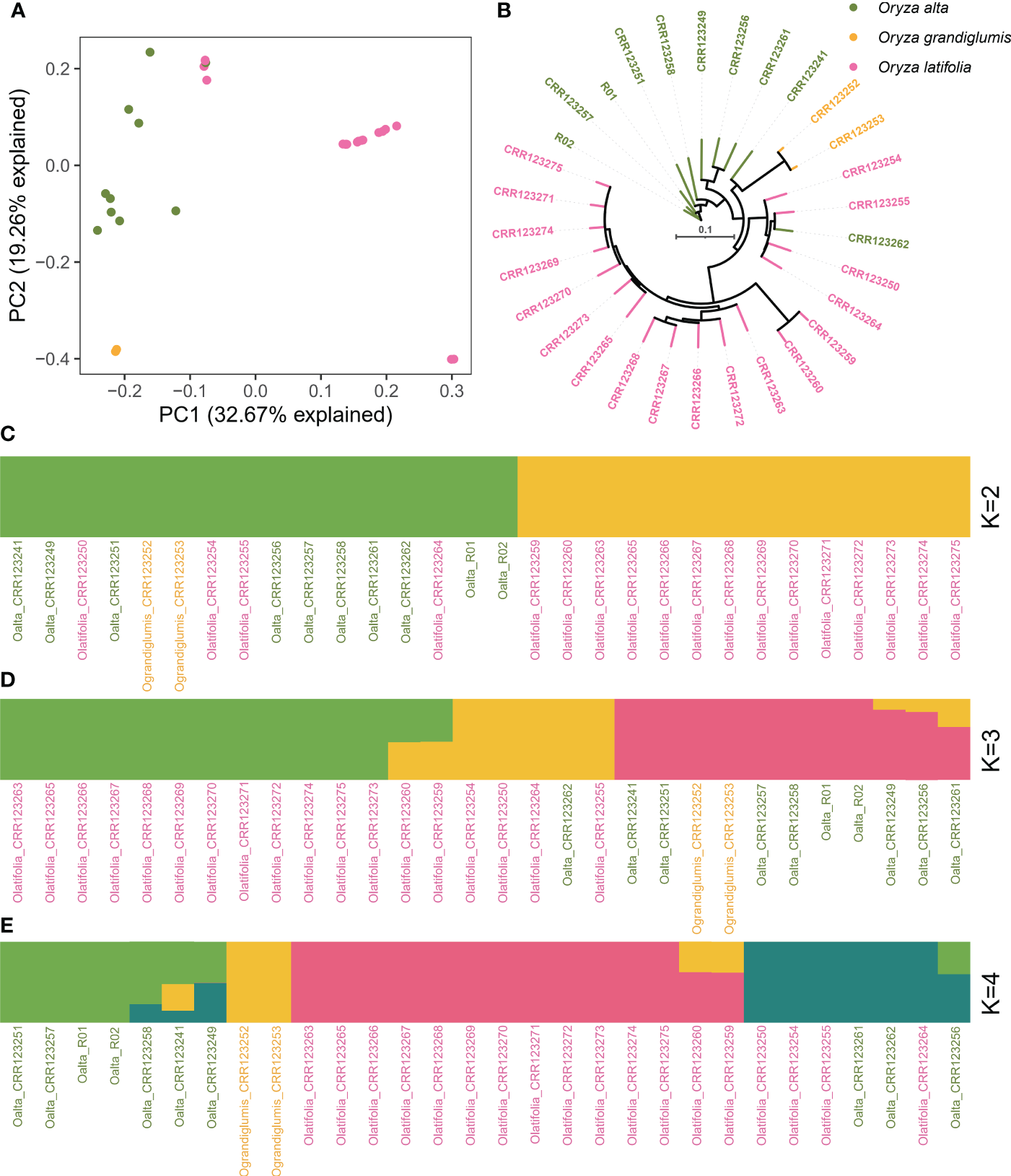 Population structure was analyzed using genomic SNP variations using polyploid rice 1 (PPR1, O. alta, CCDD) as the reference genome. Together with Huaye 5 and previously released eight O. alta (OA), two Oryza grandiglumis (OG), and 18 Oryza latifolia (OL) accessions, the population structure of 30 wild rice accessions with CCDD genome were analyzed using PCA, phylogenetic tree, and admixture method (Figure 5). PCA results were plotted using the first two principal components, which explained 32.67% and 19.26% variations for PC1 and PC2, respectively (Figure 5A). Three species could be classified using PCA (Figure 5A) and phylogenetic tree, except for four OL accessions, which were clustered with OA in PCA (Figure 5B). Admixture analysis with two subgroups (k = 2) clustered 14 OL accessions in a cluster while 10 OA, four OL, and two OG accessions in another cluster (Figure 5C). When the subgroup number was set to 3, the same 14 OL accessions were also grouped together, four OL and one OA accessions were in the second group, and nine OA and two OG accessions were in the third group (Figure 5D). If the subgroup number was 4, 14 OL accessions were also grouped together, seven OA accessions and two OG accessions were grouped in another two groups, and four OL and three OA accessions were in the last group (Figure 5E).