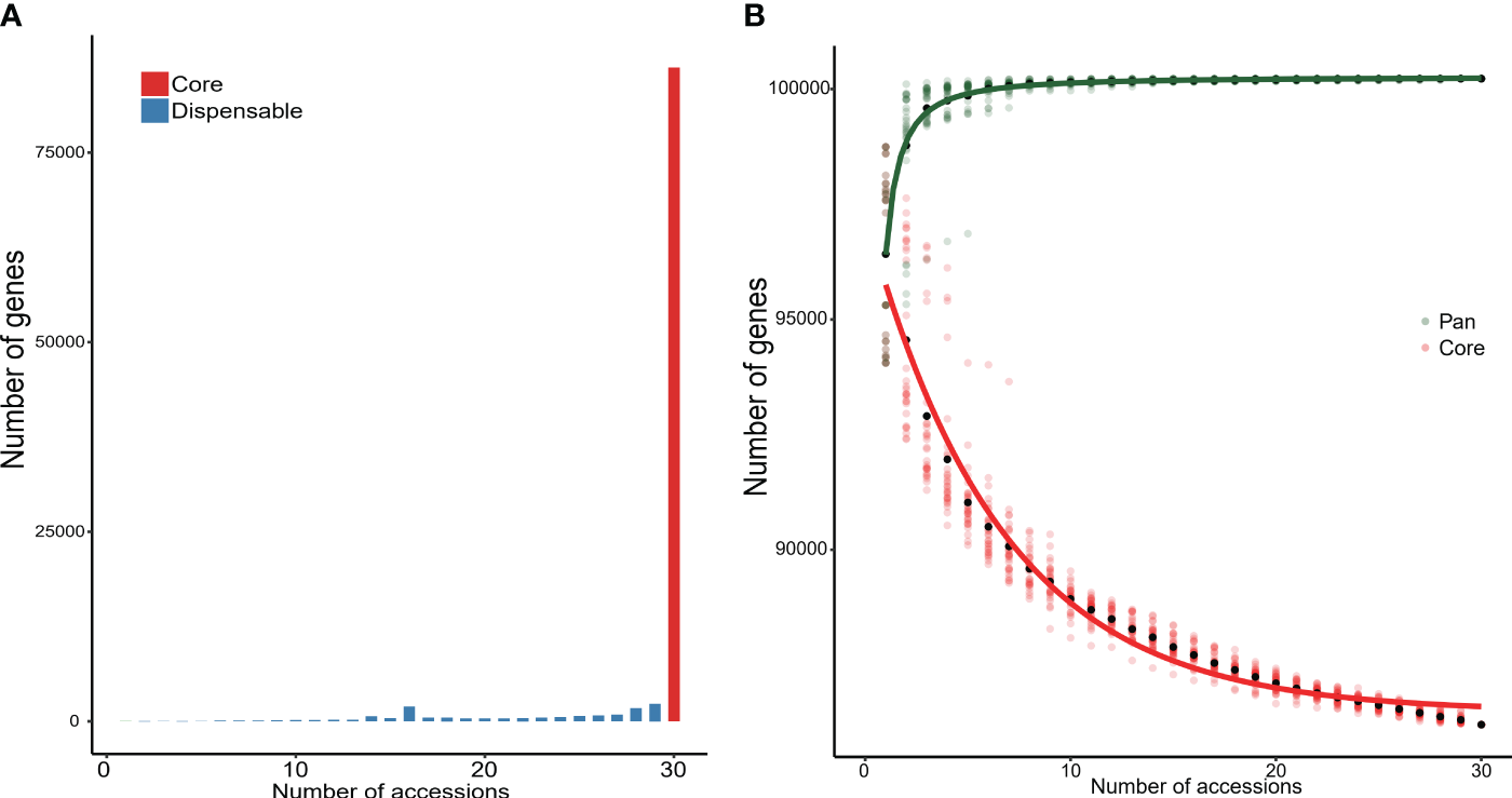 The 30 wild rice accessions with the CCDD genome were used to detect NRR sequences using a metagenome-like pan-genome analyzing strategy with the PPR1 genome as the reference. A total of 8.39-Mb NRR sequences were assembled with lengths longer than 10 kb; the average length and N50 for assembled contigs were 12.84 kb and 12.53 kb, respectively. Genes in those sequences were annotated, and 926 genes were predicted as novel genes in NRR sequences. Gene presence and absence variations (PAVs) were detected by remapping sequencing reads to the pan-genome. Genes that presented in all accessions were considered core genes, and genes that presented in partial accessions were considered dispensable genes. The number of genes was augmented with the addition of accessions, the final pan-genome gene size was 100,226, the number of dispensable genes was decreased with the addition of accessions, and the final core-genome gene size was 86,204 (Figure 6).