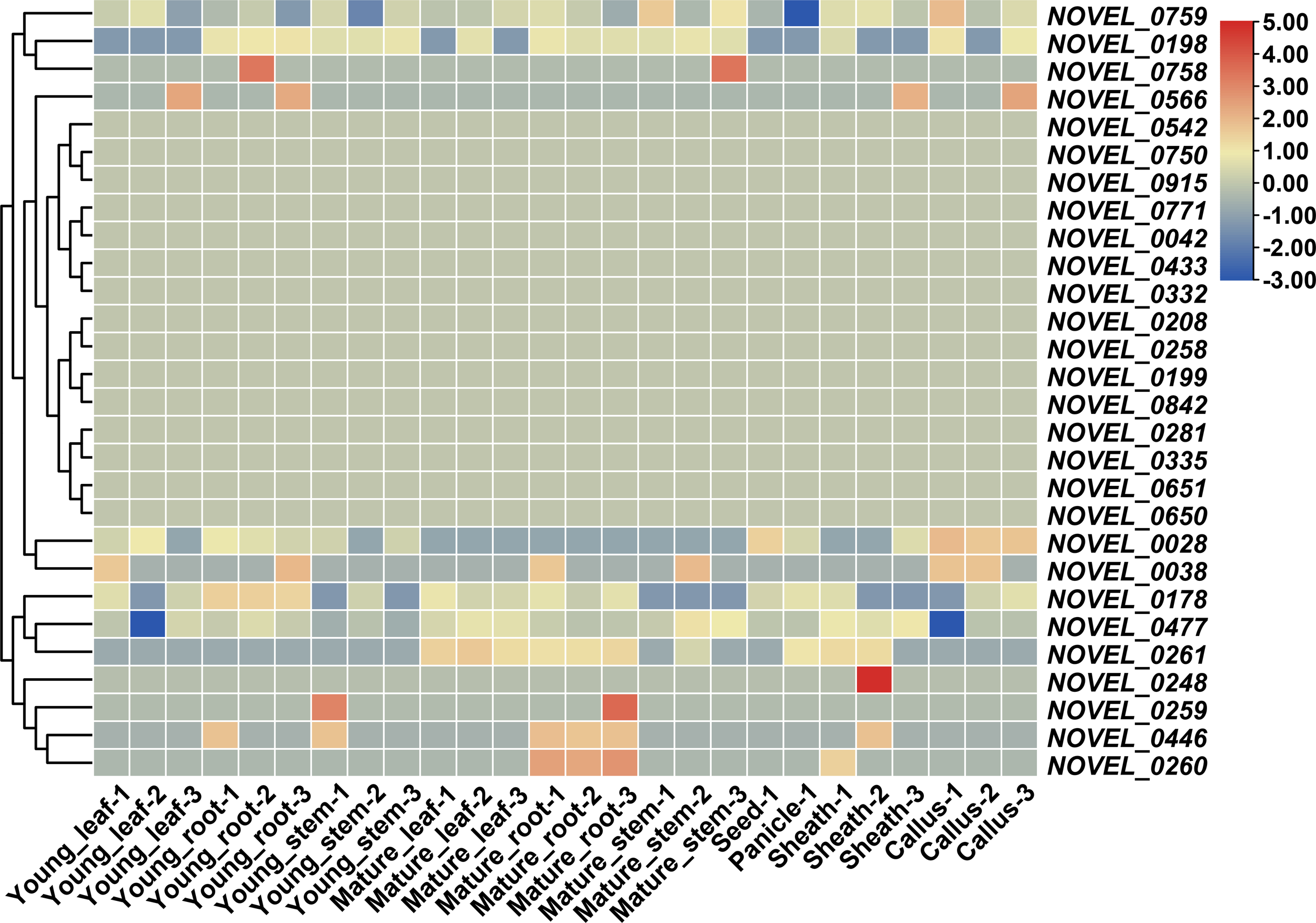 Novel genes were annotated using the EggNOG database, and the NBS-LRR genes were detected using the NB-ARC domain. A total of 28 non-reference NBS-LRR genes were revealed, and three of them were experimentally validated by PCR amplification and Sanger sequencing (Supplementary Figures S3–S5, Supplementary Table S2). Their expression patterns were analyzed using transcriptome data from the 26 samples. Thirteen genes were expressed in 23 RNA sequencing samples, including seven genes (NOVEL_0759, NOVEL_0198, NOVEL_0028, NOVEL_0038, NOVEL_0178, NOVEL_0477, and NOVEL_0261), which have potential constitutive expression in all tissues, and two genes (NOVEL_0446 and NOVEL_0260), which were mainly expressed in mature roots (Figure 7). Expression patterns of those novel genes imply their molecular function for further research.