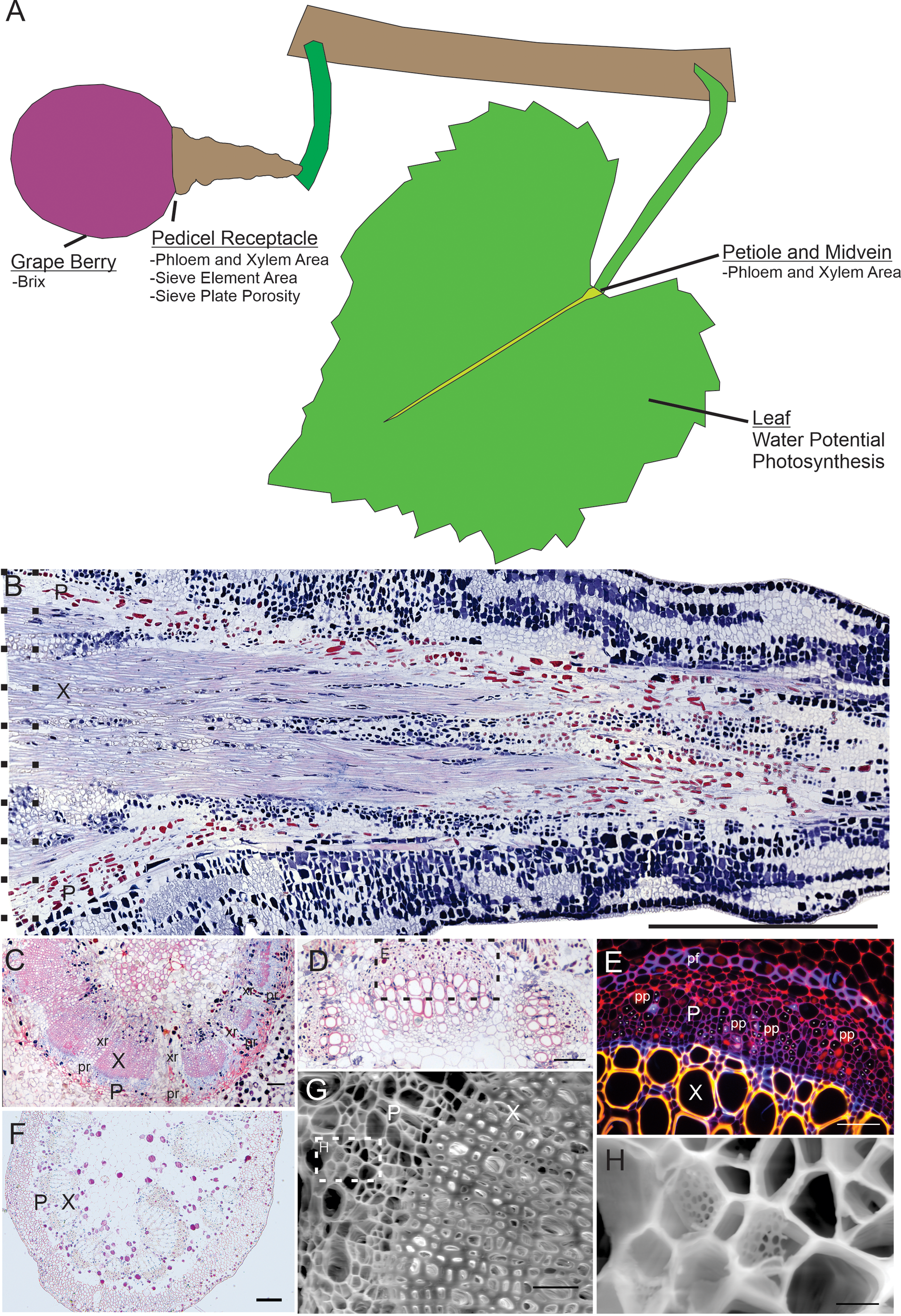 Overview of organs sampled, and representative anatomical sections surveyed. (A) Overview diagram of the organs sampled for chemistry (grape berry) and organs sectioned for anatomy (pedicel, petiole, midvein), as well as leaf physiology data. (B) Longitudinal section of grape berry pedicel showing phloem area (P) and xylem area (X). Dotted lines indicate the approximate area of the pedicel receptacle where cross sectional areas were measured. Scale = 1mm. (C) Cross section of pedicel showing xylem, phloem, xylem rays (xr) and phloem rays (pr). Scale = 100µm. (D) Cross section of a leaf midvein. Scale = 100µm. (E) Inset from panel D showing magnified area under fluorescent light (G/R filter cube), labeling xylem, phloem, phloem fibers (pf) and phloem parenchyma (pp). Asterisks indicate location of sieve elements based upon callose fluorescence signature. Scale = 100µm. (F) Cross section of petiole showing xylem and phloem. Scale = 100µm. (G) SEM image of pedicel showing xylem and phloem. Scale = 50µm. (H) Magnified inset from panel G showing example sieve plates. Scale = 5µm. All shown sections taken from Syrah.