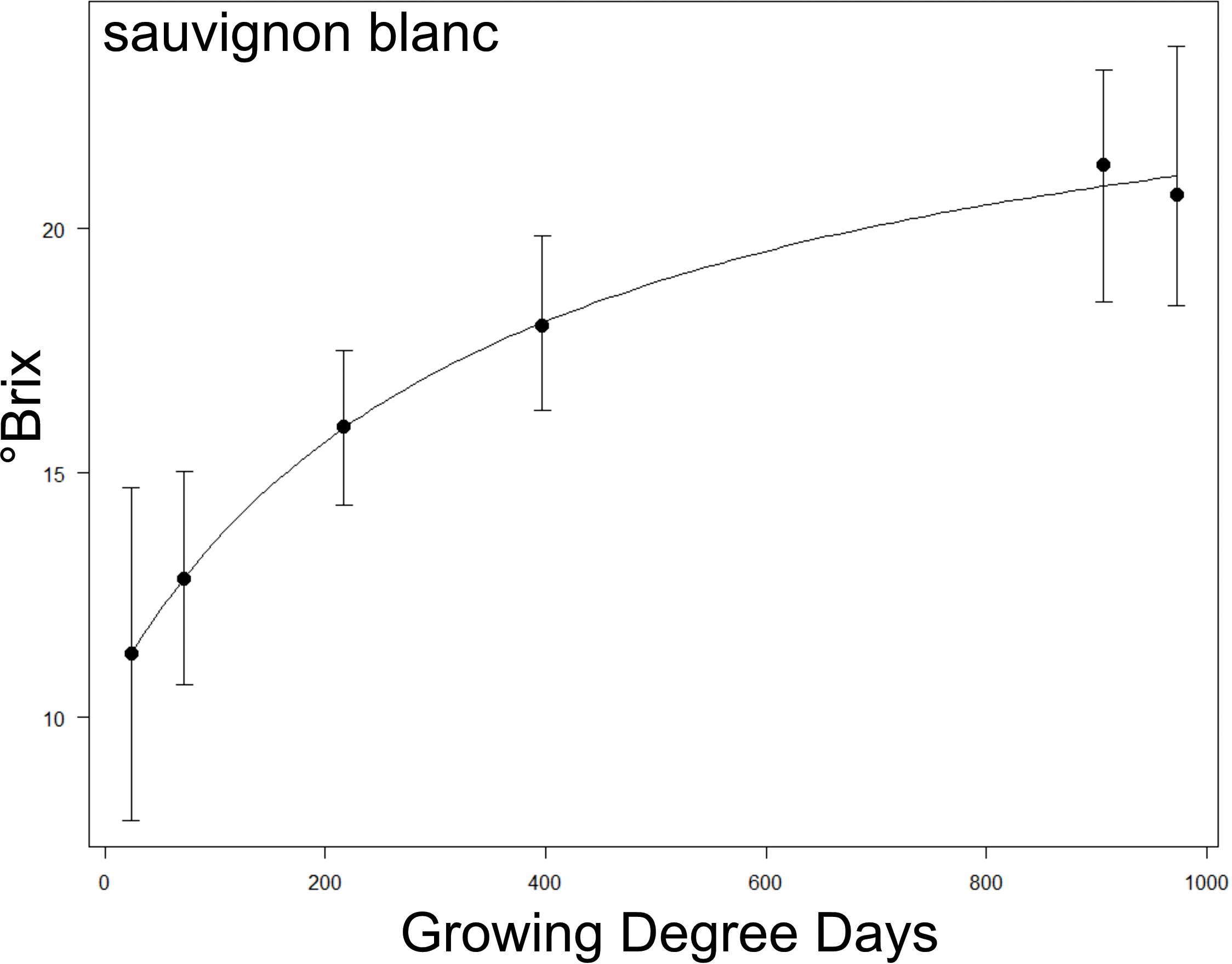 Example of a °Brix sugar accumulation curve over Growing Degree Days (GDD) taken from Sauvignon Blanc. The relationship between the two parameters was fitted to a logistic function, and the maximum °Brix accumulation rate was extracted via the maximum steepness of the fitted curve (see methods). See Supplementary Figure S2 for curves of all cultivars.