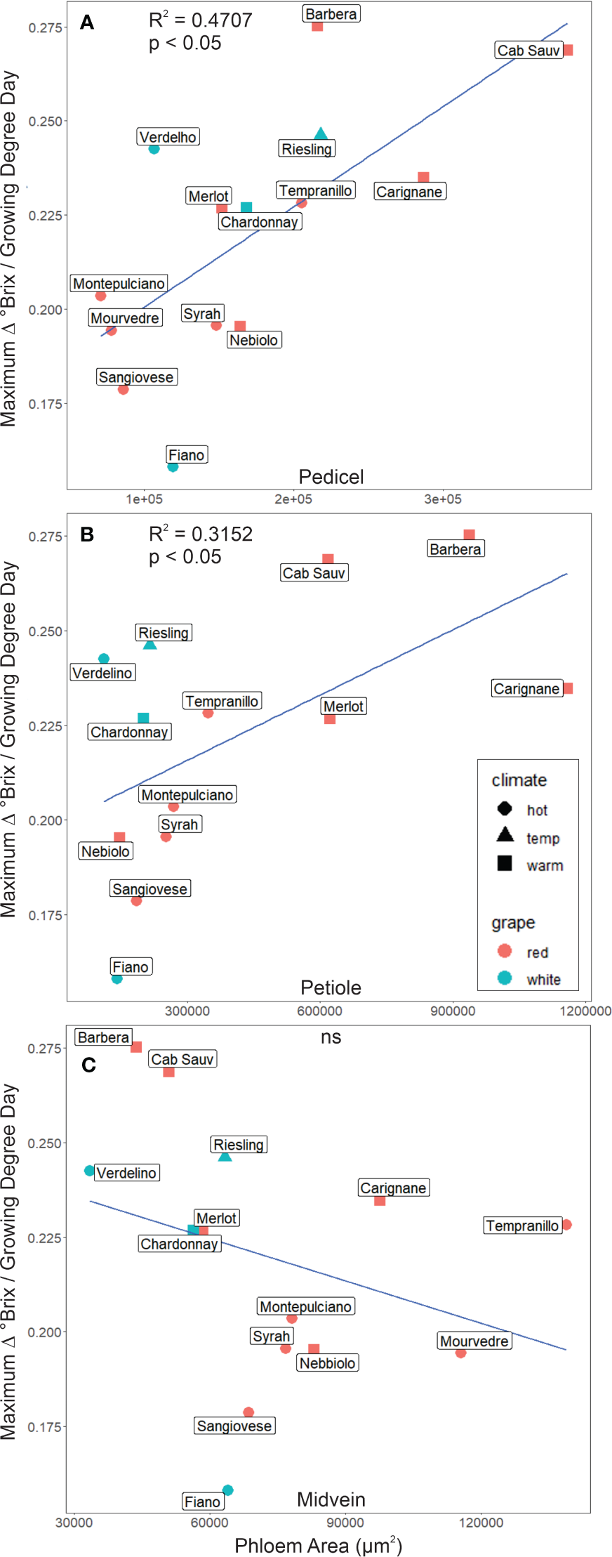 The maximum rate of change in °Brix as a function of phloem area for different cultivars sampled. (A) Phloem area was a significant predictor of °Brix accumulation rate in pedicels in addition to (B) petioles. In contrast, phloem area in (C) midveins was not a significant (ns) predictor of °Brix accumulation rate.