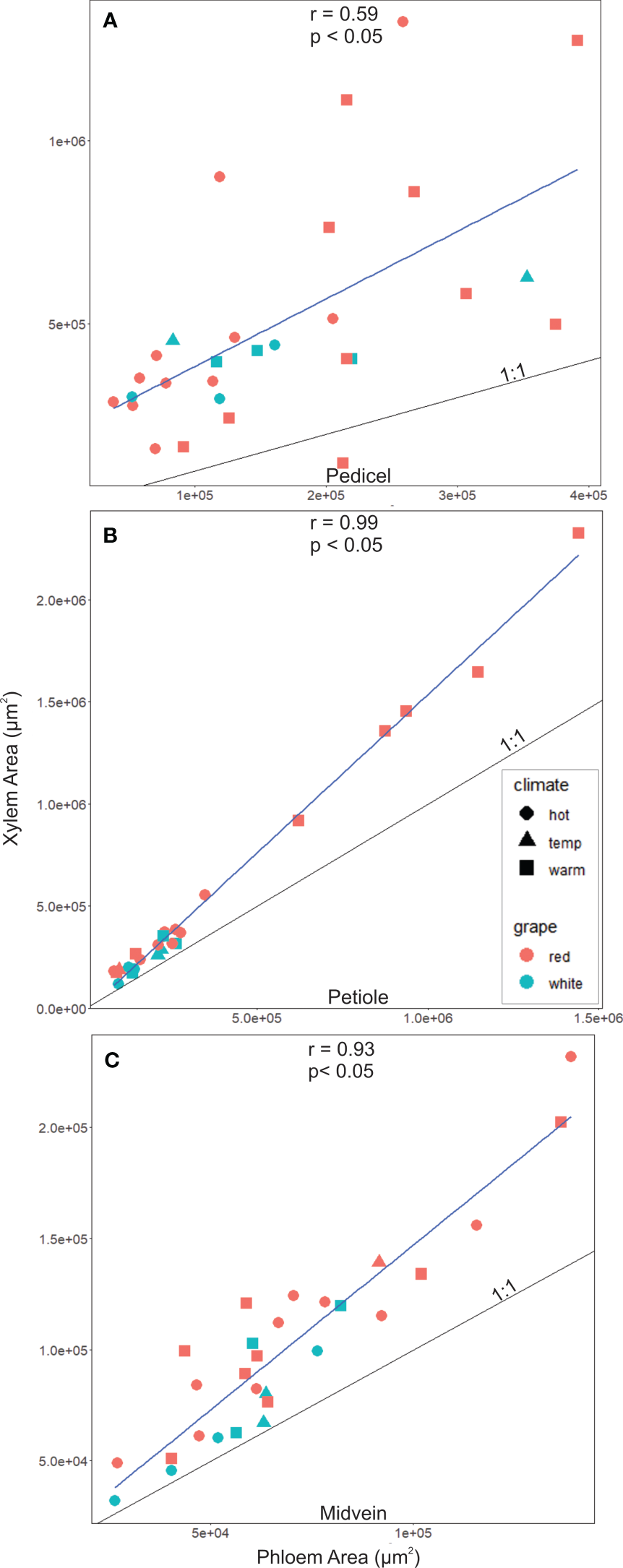 where TMAX and TMIN are the daily maximum and minimum temperatures, respectively, and TBASE is a minimum threshold growing temperature, which was set to the historic default for grapevine, 10°C (McMaster and Wilhelm, 1997; Zapata et al., 2015). Simple linear regressions were then used to test correlations between maximum °Brix accumulation rates and leaf lamina, petiole, and pedicel phloem and xylem cross-sectional area and mean sieve element area and sieve plate porosity for the pedicels. Two cultivars (Pinot Noir and Sauvignon Blanc) were excluded due to sample quality being too poor to establish reliable anatomical measurements. We also examined relationships between xylem and phloem anatomy by using linear regression to test correlations between xylem and phloem cross-sectional area.