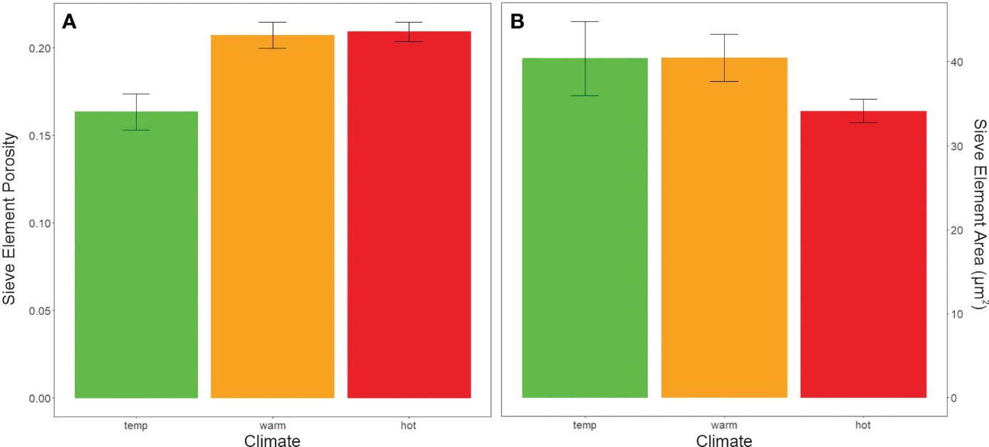 Mean sieve element area and sieve plate porosity were measured by manually tracing individual sieve elements (Figure 1G, H) and sieve plates and pores with ImageJ software. Sieve element area was calculated by identifying 1 – 3 sieve plates and 3 – 11 images per vine. Sieve element area measurements included the cell wall area. Sieve plate porosity (Equation 2) was calculated as: