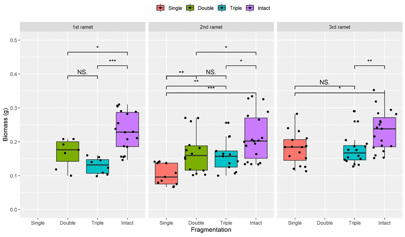 Figure 2 Biomass of surviving clonal ramet at different growth stages of each clonal fragment (single, double, triple, control/intact). Significant differences between each treatment is denoted by asterisks::*P < 0.05; **P <0.01; and ***P < 0.001; NS indicates non-significant differences between each treatment (P ≥ 0.05); Within each rhizome, the three adjacent ramets closest to the rhizome apex (labeled as 1st, 2nd, and 3rd).