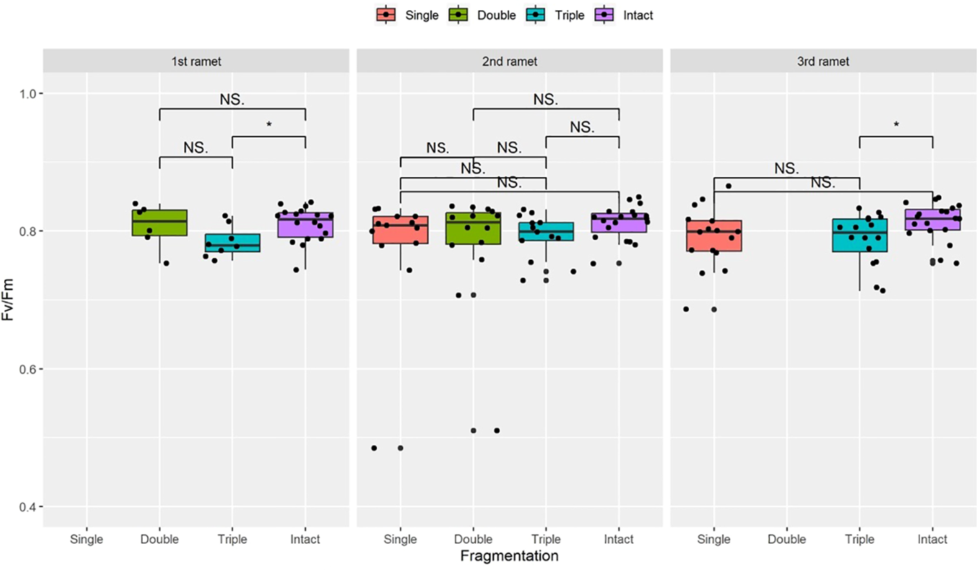 Figure 3 The maximum quantum yield of PS II (Fv/Fm) surviving clonal ramet at different growth stages of each clonal fragment (single, double, triple, control/intact). Significant differences between each treatment is denoted by asterisks:*P < 0.05; NS indicates non-significant differences between each treatment (P ≥ 0.05); Within each rhizome, the three adjacent ramets closest to the rhizome apex (labeled as 1st, 2nd, and 3rd).