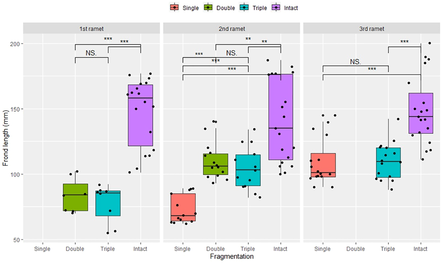 Figure 4 Frond length of surviving clonal ramet at different growth stages of each clonal fragment (single, double, triple, control/intact). Significant differences between each treatment is denoted by asterisks::*P < 0.05; NS indicates non-significant differences between each treatment (P ≥ 0.05); Within each rhizome, the three adjacent ramets closest to the rhizome apex (labeled as 1st, 2nd, and 3rd).