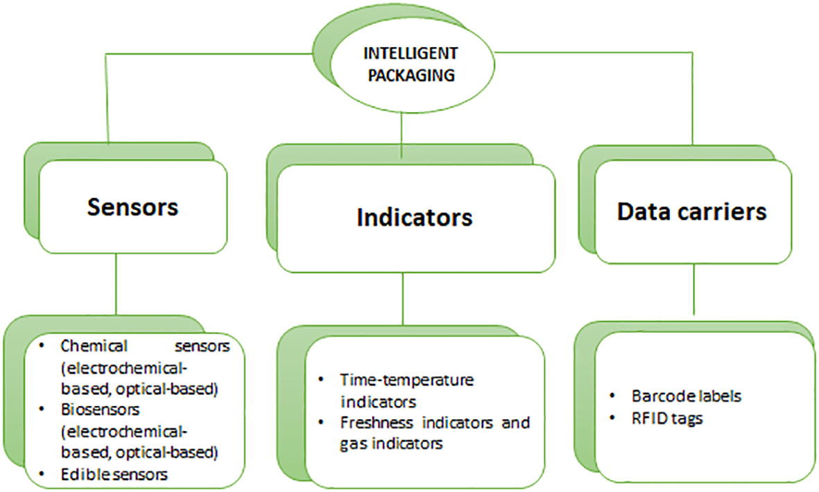 In 2004, the European Commission defined intelligent packaging materials as “materials and articles that monitor the condition of packaged foods or the surrounding environment” (Ghaani et al., 2016). A thorough evolution is taking place in both of these fields, which leads to ever-changing definitions of intelligent and active packaging. Active packaging refers to a package that adjusts to suboptimal physiological or environmental conditions to improve them. In addition to barcodes, radio frequency identification tags (RFIDs), sensors, and indicators, intelligent packaging is also called smart packaging since it is equipped with smart devices for communicating, monitoring, sensing, recording, tracking, and indicating food safety, quality, and history during the supply chain (Wilson, 2007; Kalpana et al., 2019). To become more efficient and effective, intelligent packaging systems are being developed. A novel packaging idea will ensure the quality of packed food during shipping and storage by maintaining the food state (Kaushani et al., 2022).