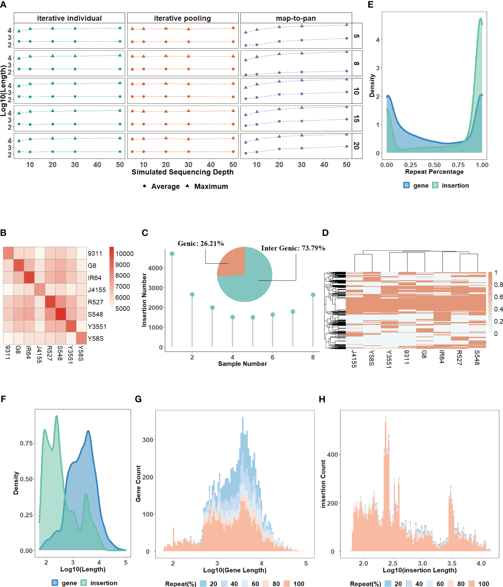 (A) The average and maximum lengths of assembled contigs for three strategies across varied sequencing depths. (B) A heatmap of the overlapping number of insertions between paired samples in the group consisting of 8 samples. (C) A pie chart showing the percentage of insertions found in genic versus intergenic regions and the distribution of insertion numbers as samples increase in the group consisting of 8 samples. (D) A heatmap of the presence and absence profile for insertions across samples in the group consisting of 8 samples. The distribution for the repeat content percentage (E) and length (F) of novel sequences from the validated data set for the group consisting of 8 samples. The distribution for the count of novel genes (G) and insertions (H) with different lengths and repeat content percentages in the group consisting of 8 samples.