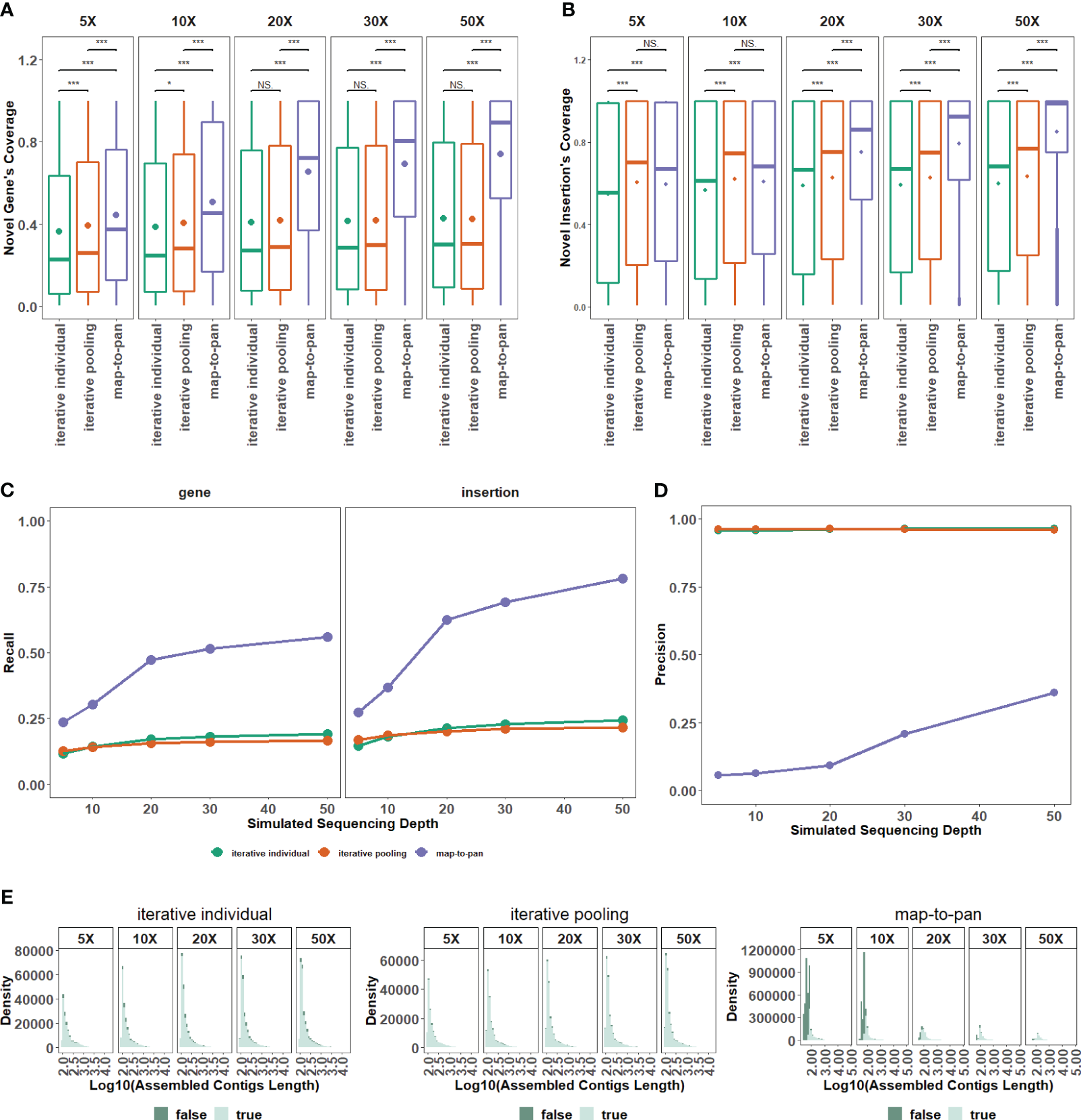The impact of sequencing depth on three strategies. (A) The distribution for recovered coverage of sequences from the testing dataset to novel genes from the validated dataset for the three strategies across varied sequencing depths. (B) The distribution for recovered coverage of sequences from the testing dataset to insertions from the validated dataset for the three strategies across varied sequencing depths. (C) Recall distribution for the three strategies across various sequencing depths. (D) Precision distribution for the three strategies across various sequencing depths. (E) Distribution of assembled length, categorized by false and true tags, for the three pan-genome construction strategies of the plant. NS means P > 0.05, * means P ≤ 0.05, ** means P < 0.01, *** means P < 0.001.