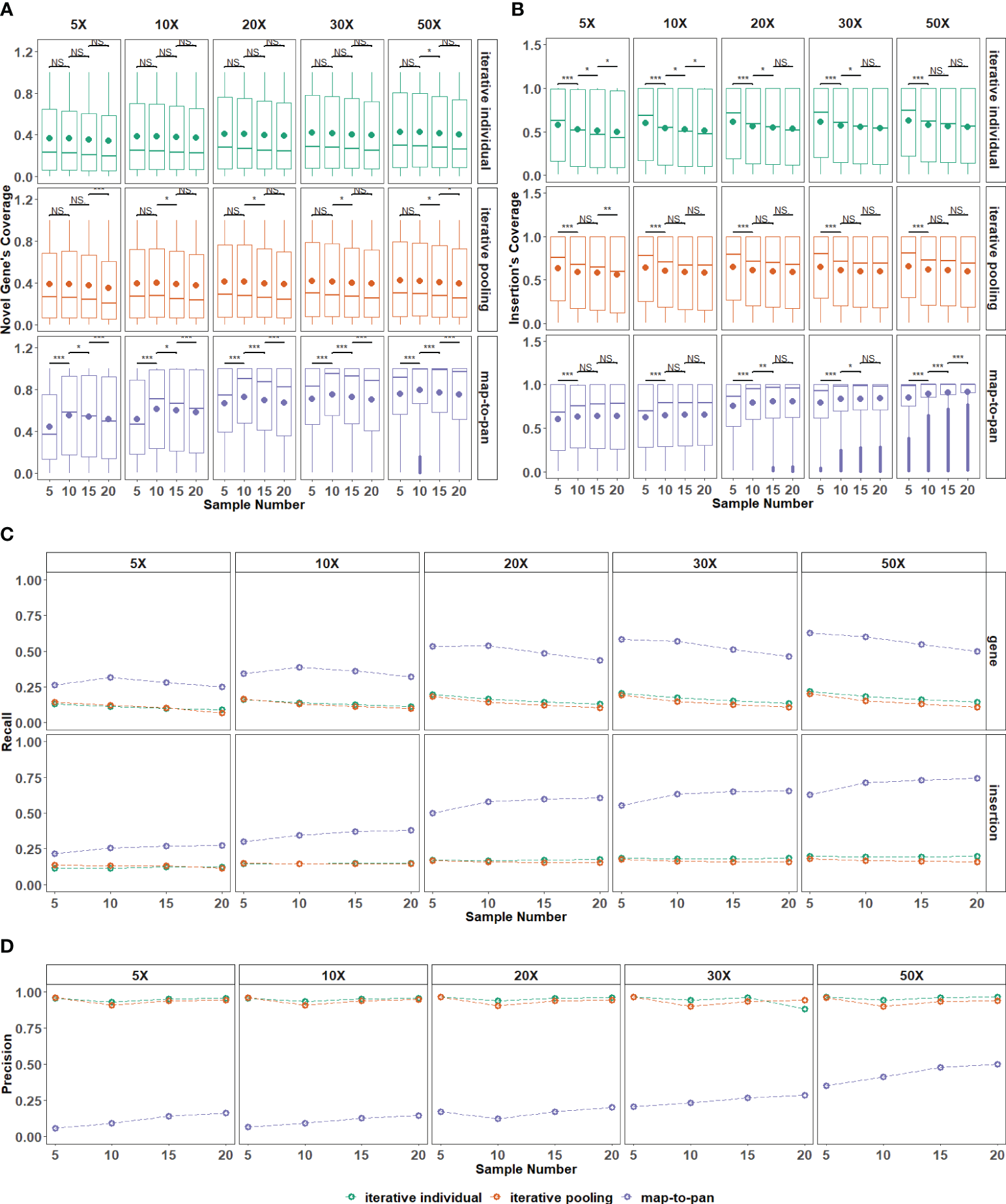 Recall and precision values are further used to evaluate sample size influence on these three strategies. For map-to-pan, their recall value for novel genes decreases as sample size increases, while for insertions, their recall value increases as sample size increases (Figure 4C). For two iterative strategies, the sample size does not significantly influence their recall value for both novel genes and insertions from the validated data set. There is no obvious difference between iterative individual and iterative pooling.
