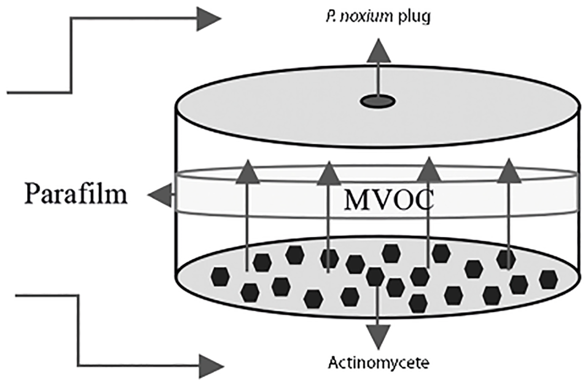 Diagram of the sandwich plate method used for the detection of inhibitory effects of VOCs produced by actinomycetes on P. noxium. The microbial VOCs (MVOC) interaction zone is shown in the center between the two plates.