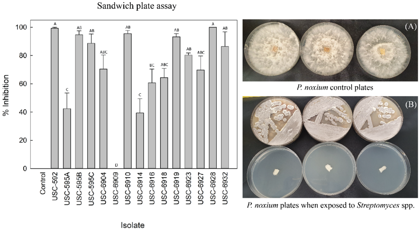 Fifteen Streptomyces isolates were assessed for antifungal VOC activity against P. noxium (F (14, 30) = 13.191, p =<0.001) (Figure 2). Fourteen of them displayed antifungal activity from their emitted VOCs, ranging from 39.39%-100% inhibition. Isolate USC-6928 exhibited the strongest activity (100%), followed by USC-592 (99.24%), USC-6910 (95.45%) and USC-595B (94.69%) (Figure 2). These four most active strains were selected for further analysis.
