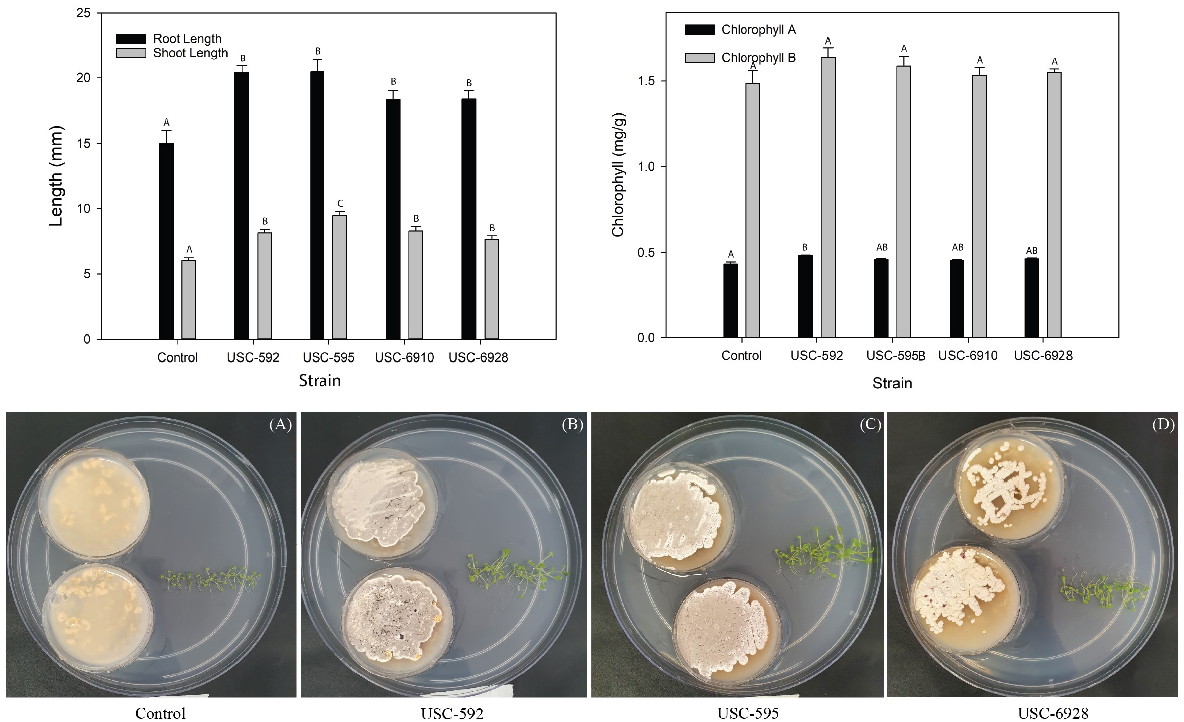 Comparison of root and shoot length and chlorophyll A and B content of the Arabidopsis thaliana after 2-week exposure to VOCs produced by the streptomycetes (mean + 1SE). (A) Control (only oatmeal agar), (B) USC-592, (C) USC-595 and (D) USC-6928.