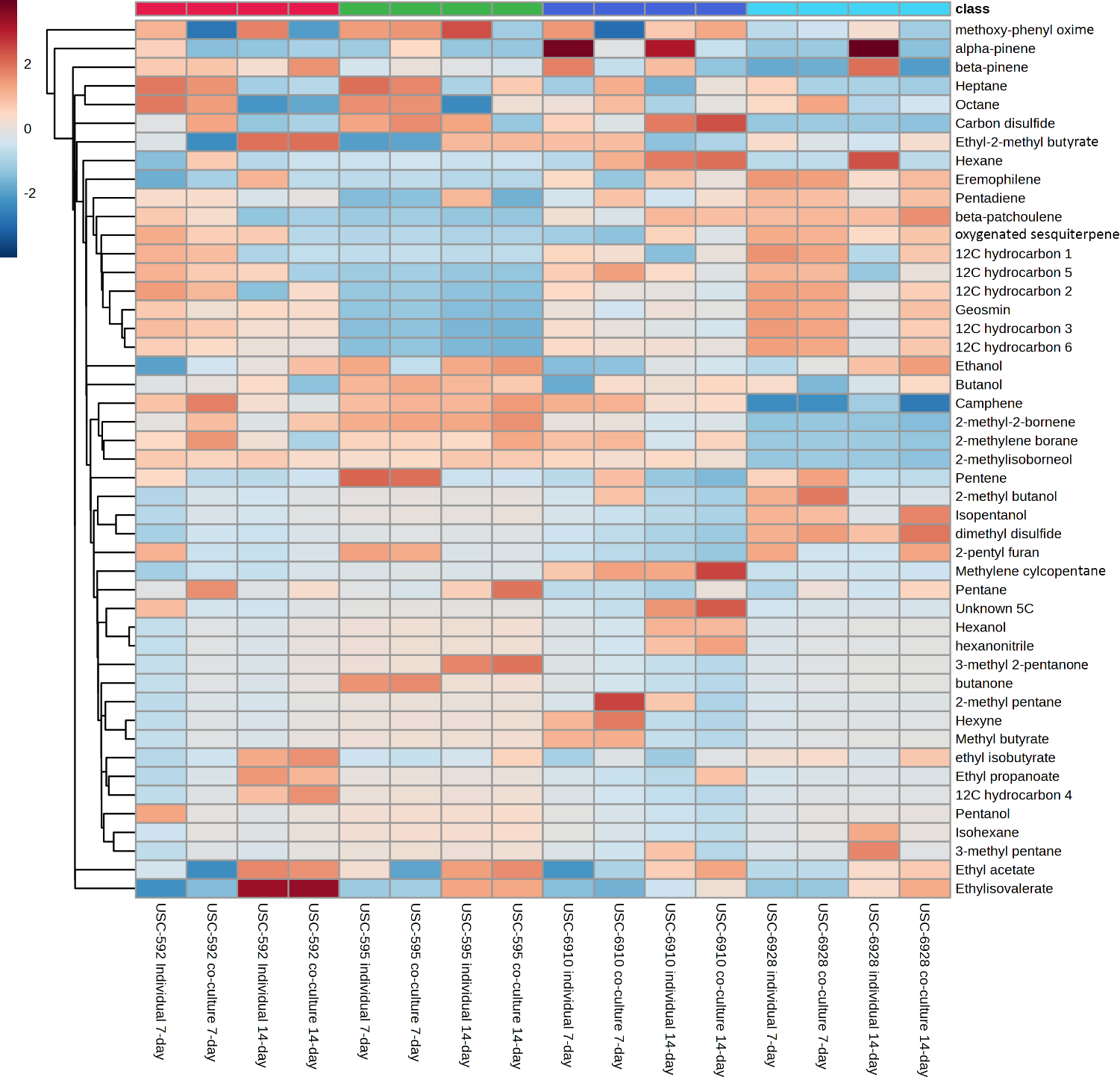 Hierarchical cluster and heat-map analysis of VOC profiles of the streptomycete isolates using Euclidean Distance with arithmetic mean clustering. Columns represent different sample conditions. Rows represent different VOCs (red, high abundance; blue, low abundance).