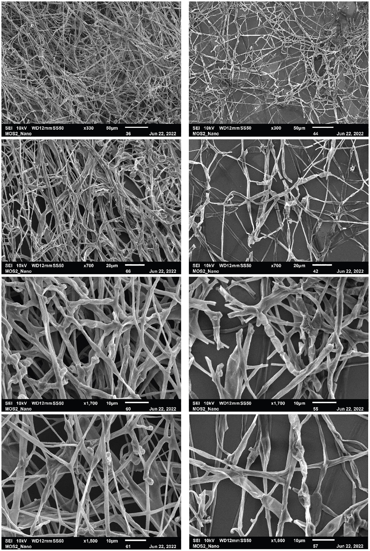 Scanning electron micrographs of P. noxium grown in the absence (left-side) and presence (right-side) of the VOCs produced by the streptomycete isolate USC-595B. Scale bar is 50 µm, 20 µm, 10 µm and 10 µm from top to bottom respectively.