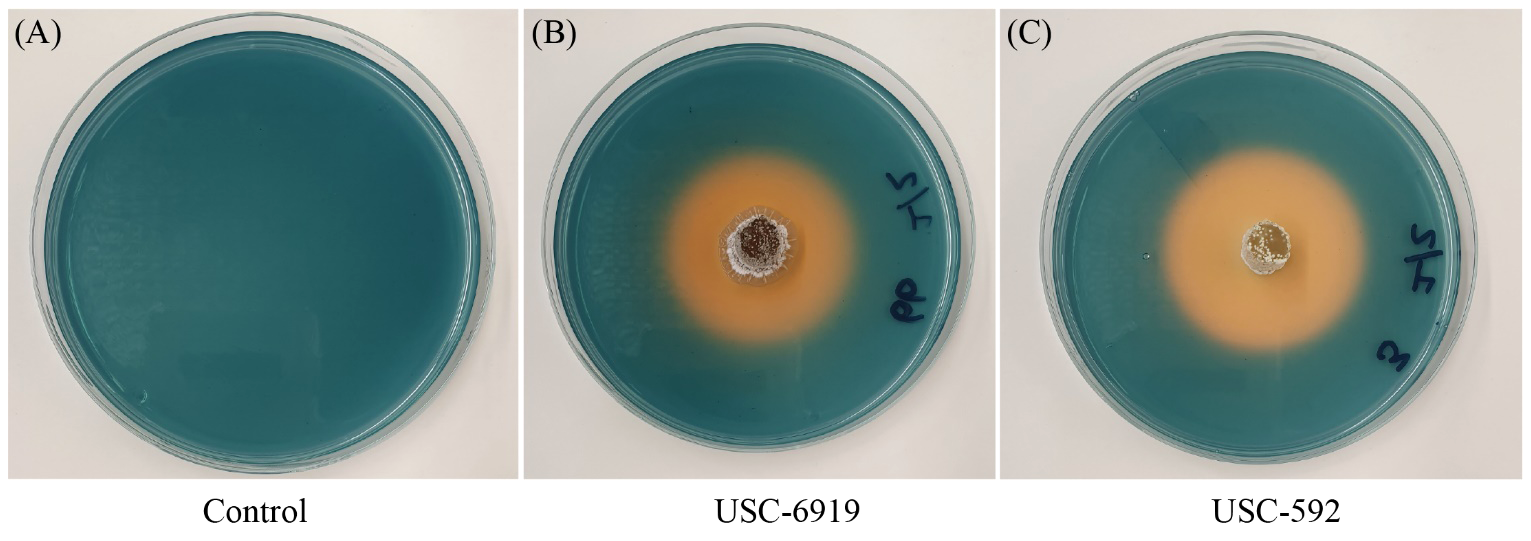 Detection of siderophore production among the streptomycete isolates. Orange clearance zones are indicative of the level of production. (A) Control CAS agar plate (B) strain USC-592 (C) USC-6919.