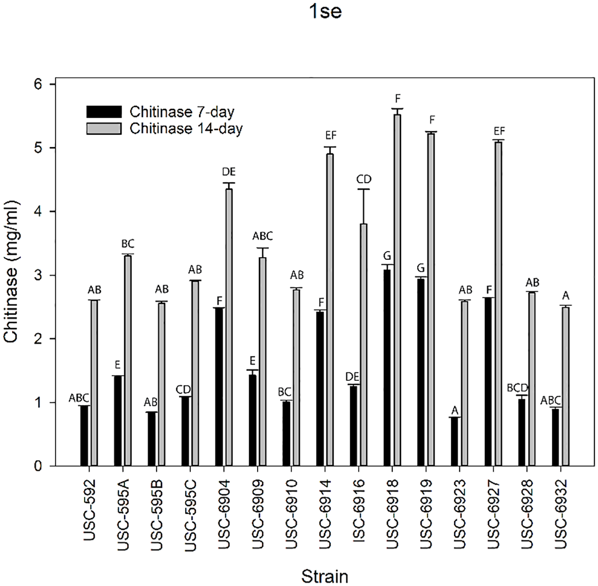 Mean values (+ 1SE) of chitinase production from the termite gut-associated streptomycetes after 7 and 14-days of growth. Letters indicate significant differences according to the Tukey test.