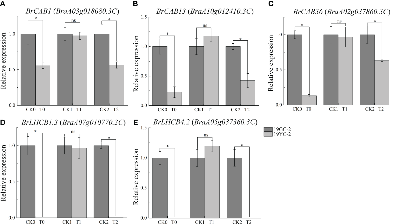 Expression analysis of DEGs related to photosynthetic antenna proteins by qRT-PCR in 19GC-2 and 19YC-2. (A)BrCAB1 gene. (B)BrCAB13 gene. (C)BrCAB36 gene. (D)BrLHCB1.3 gene. (E)BrLHCB4.2 gene. CK0, T0, CK1, T1, CK2, and T2 represent the six cDNA libraries from 19GC-2 and 19YC-2. ns, no significant; *P < 0.05.