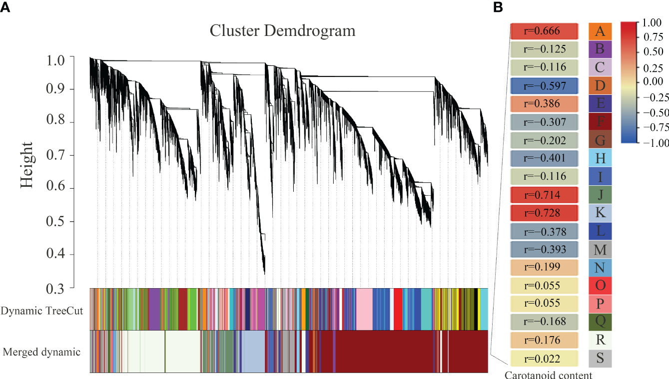 Association analysis between DEGs and carotenoid contents by weighted gene co-expression network analysis (WGCNA) in 19GC-2 and 19YC-2. (A) The hierarchical cluster tree of correlated modules. (B) The identified highly correlated modules represented by different letters from A to S.