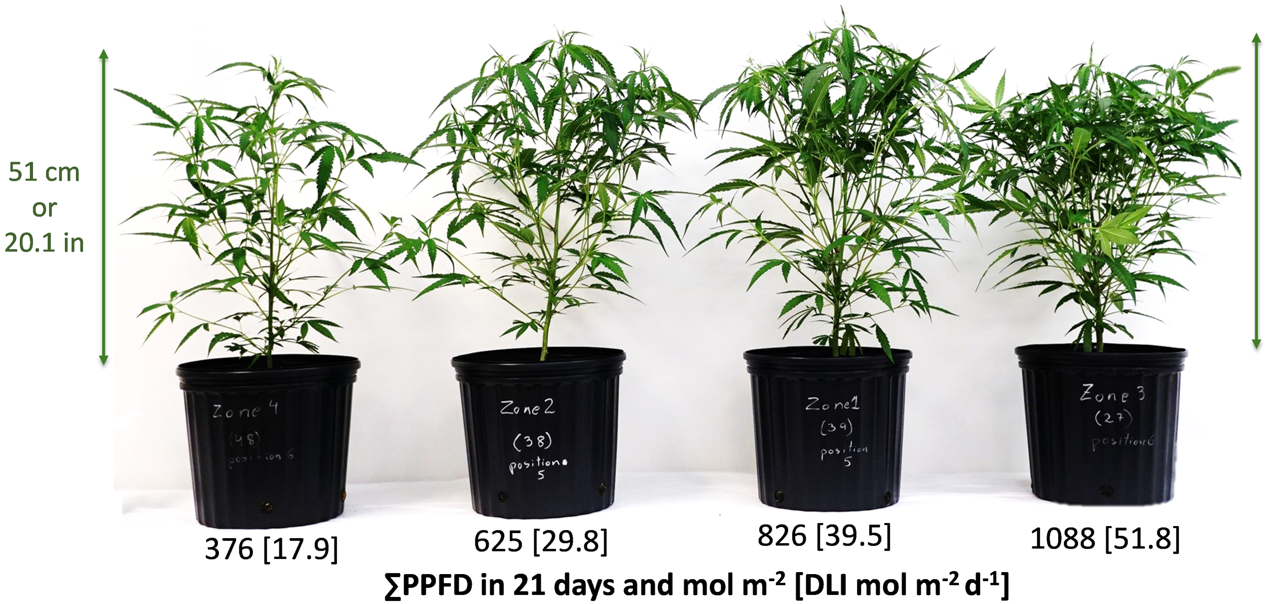 The study involved the examination of two hypotheses. 1) Increments in the cumulative light dosage would elicit an increase in plant growth and in the number of branches. 2) Leaves of cannabis plants cultivated under an elevated DLI would display higher WUE due to increased photosynthetic rates than their counterparts exposed to a lower DLI when leaves were evaluated under high PPFDs.