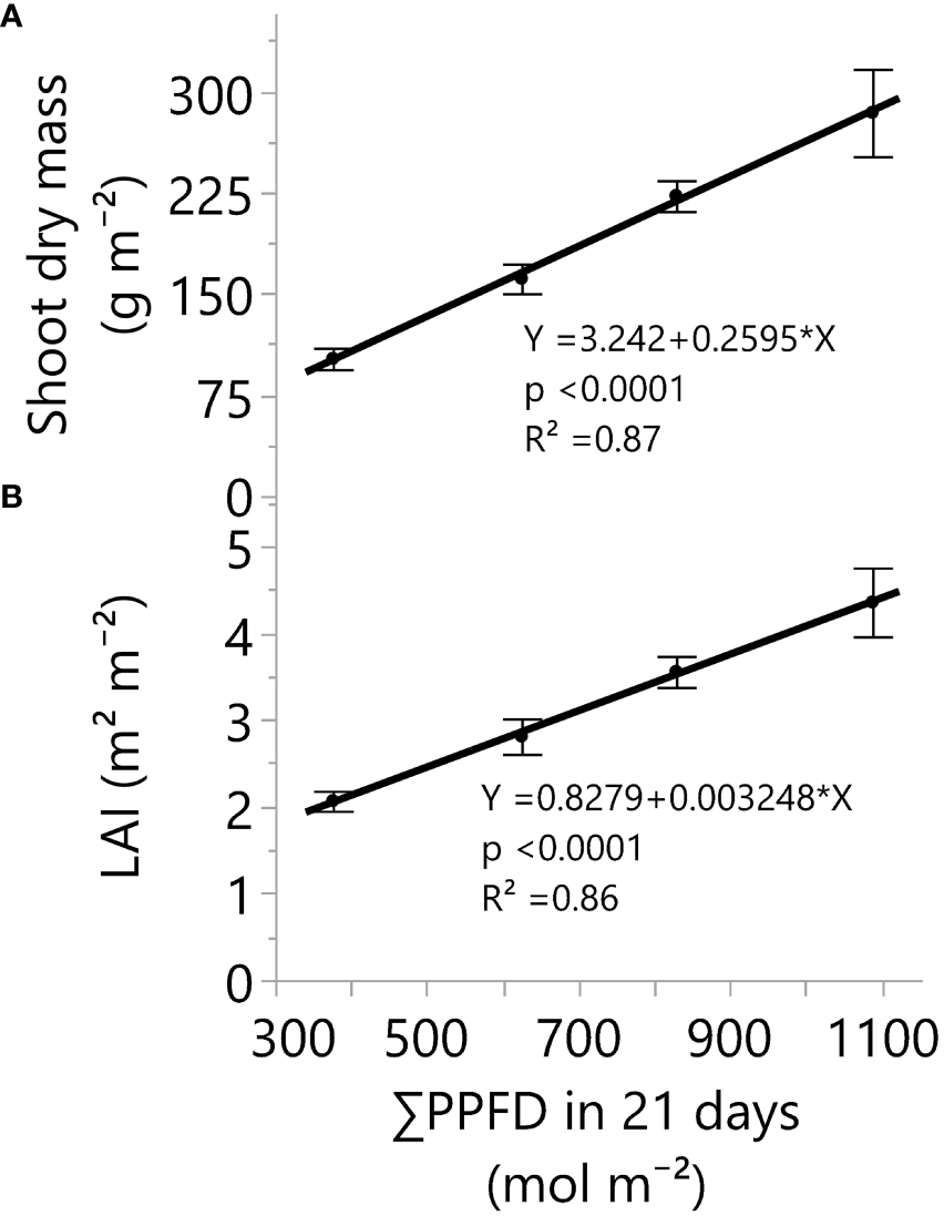 ∑ePAR and eDLI are cumulative photons based on an extended PAR range 400 to 750 nm (Zhen et al., 2021). Means and standard deviations were calculated from the three greenhouse plots per light level. The photoperiod was maintained at 18 hours.