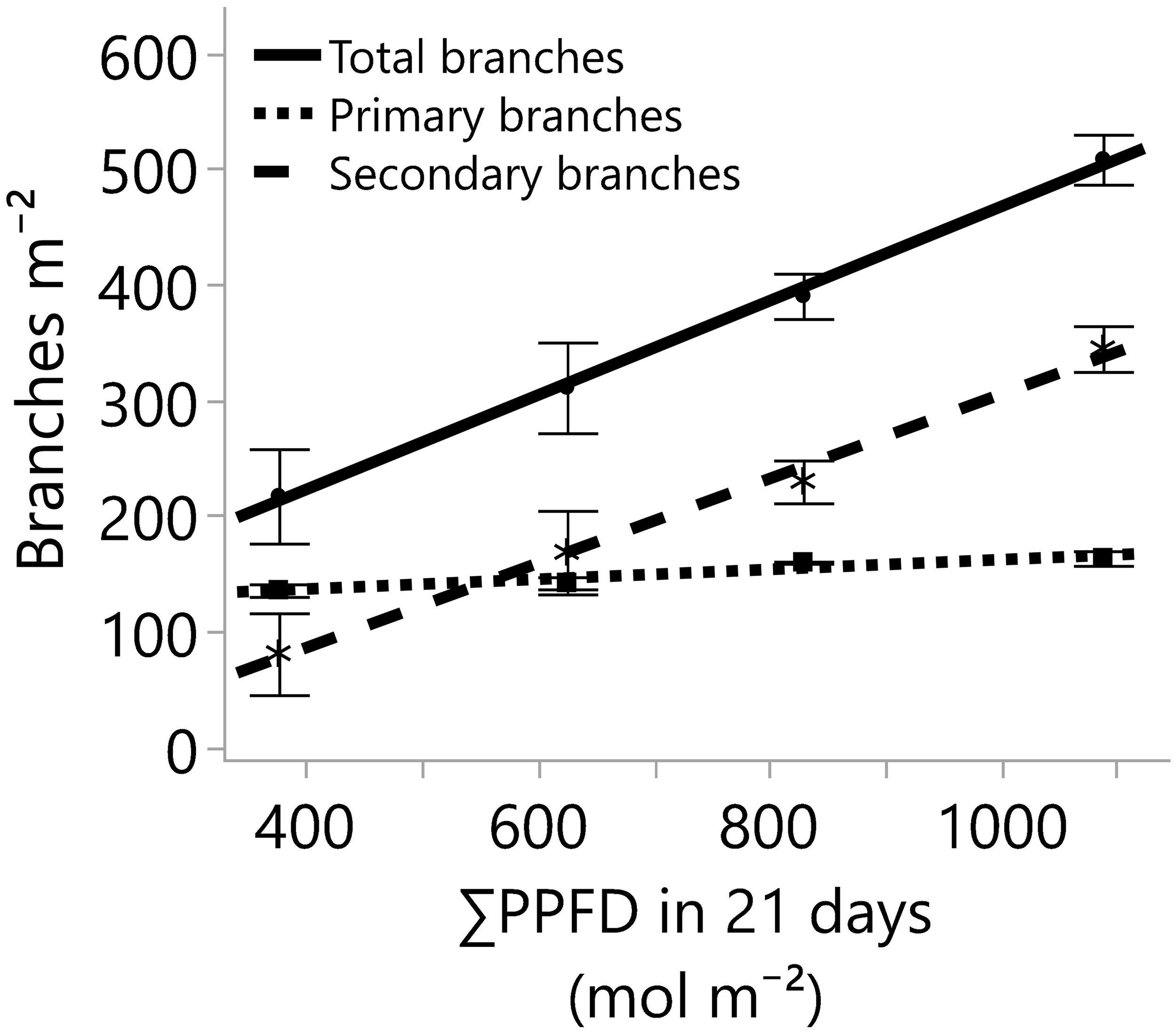 Photosynthetic photon flux density from 400 to 700 nm) measured with a line quantum sensor (mean ± standard deviation).