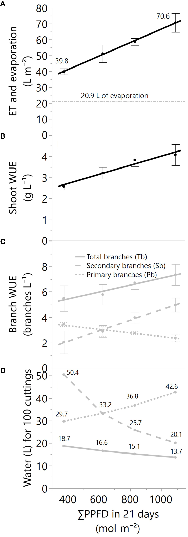 WUE (Water Use Efficiency): Shoot water use efficiency was calculated as the ratio between the dry mass of leaves and stems and the litters of evapotranspiration in a 21-day period. Similarly, the ratios between primary, secondary, and total branches and evapotranspiration requirements were calculated. Leaf WUE was calculated as the ratio between photosynthesis (A) and transpiration (E).