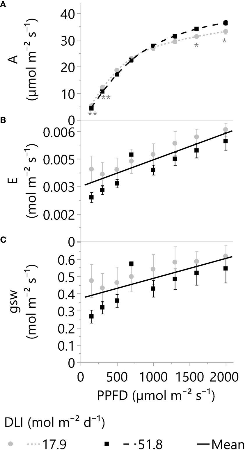 For leaf gas exchange analysis from 150 to 2000 µmol of light m-2 s-1 (PPFD), only top leaves grown under DLIs of ~18 and 52 mol m-2 d-1 were analyzed (N=6, n=3, OU=1 leaf per plot). Split-plot models were used on A, E, gsw, and WUE to evaluate responses based on the effects of DLI, PPFD, and DLI*PPFD. Light intensity (150, 300, 500, 700, 1000, 1300, 1600, and 2000 µmol m⁻² s⁻¹) effects were evaluated at the split-plot level. Consequently, the effects of long light exposure or DLI were assessed at the main plot level. In addition, DLI effects were analyzed using t-tests. T-tests were used to compare specific groups and validate this study’s second hypothesis. More specifically, one-tailed t-tests were used to evaluate the effect of DLI on leaf photosynthesis and WUE under elevated PPFDs (≥ 700 µmol m-2 s-1), while leaves under lower PPFDs were evaluated under two-tailed t-tests. All analyses and graphs were performed using JMP Pro 16.0 and 17.0 from SAS (Cary, NC, USA).