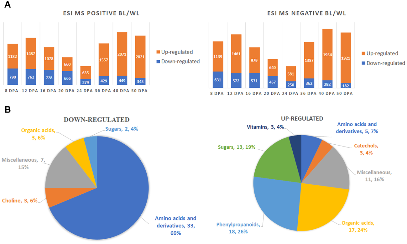 A two-way ANOVA determined that 5836 (ESI MS positive mode) and 4541 (ESI MS negative mode) metabolites were significantly different in accumulation between brown and white fibers (Supplementary Data 1). Figure 2A shows the distribution of up-regulated and down-regulated compounds in MC-BL vs. MC-WL developing and mature fiber samples. The highest number of peaks was detected by both methods at 40 DPA and the lowest at 24 DPA of fiber development. There were significantly more up-regulated than down-regulated metabolites at each developmental time point.
