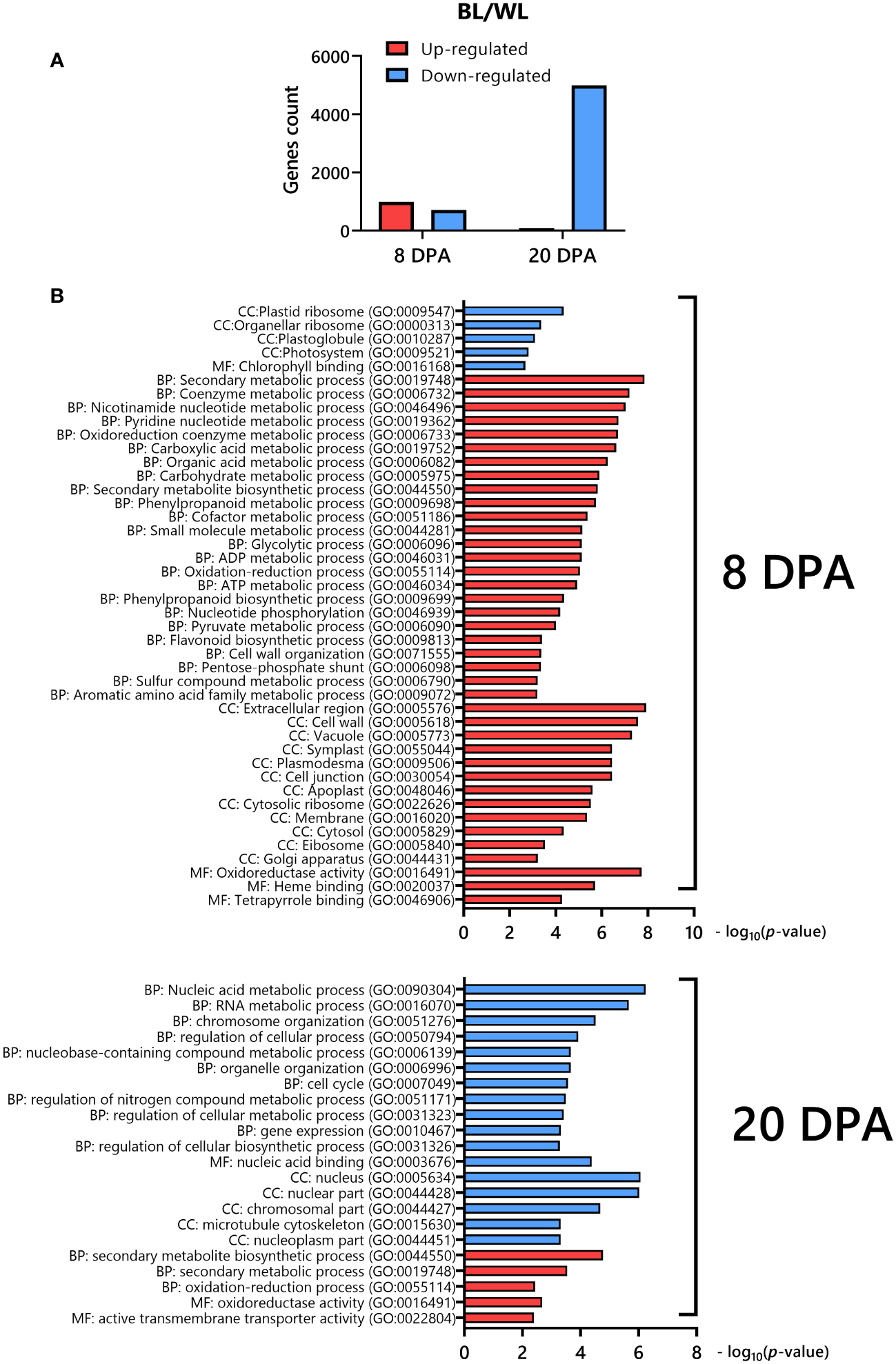We analyzed RNAseq data between the NBC and white NILs from developing fibers at 8 and 20 DPA. Two strategically essential time points, including the peak of elongation (8 DPA) and secondary cell wall (SCW) biosynthesis (20 DPA), were selected for RNAseq due to cost efficiency, with two biological replicates minimally required for statistical analysis. A two-way ANOVA determined that 1691 (8 DPA) and 5073 (20 DPA) genes were significantly (FDR < 0.05) differentially expressed (DEGs) between NILs (Supplementary Data 2). The count of up-regulated and down-regulated DEGs was 986 and 705, correspondingly, at 8 DPA (Figure 3A). However, at 20 DPA, almost all of the DEGs were down-regulated, 4993 genes (Figure 3A).