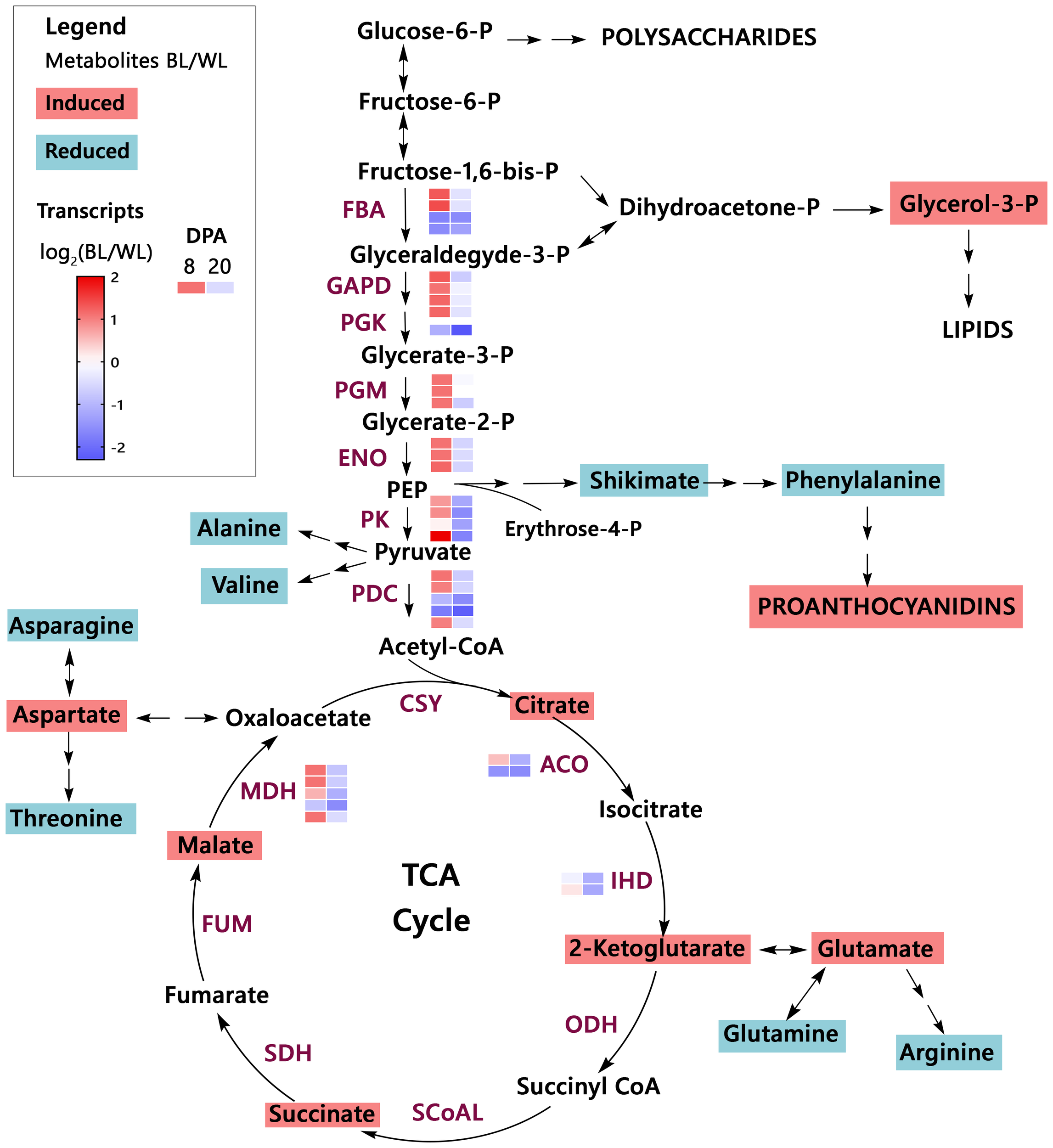 Primary metabolism overview in brown cotton. Metabolites highlighted by magenta color are significantly up-regulated, whereas metabolites highlighted by teal color are down-regulated in MC-BL fibers (Supplementary Tables 1, 2). PEP, phosphoenolpyruvate; TCA cycle, the citric acid cycle. Abbreviations of the enzymes (maroon color): FBA, fructose-bisphosphate aldolase; GAPD, glyceraldehyde 3-phosphate dehydrogenase; PGK, phosphoglycerate kinase; PGM, phosphoglycerate mutase; ENO, enolase; PK, pyruvate kinase; PDC, pyruvate dehydrogenase complex; CSY, citrate synthase; ACO, aconitase; IHD, isocitrate dehydrogenase; ODH, 2-Oxoglutarate Dehydrogenase complex; SCoAL, Succinyl-CoA Ligase; SDH, succinate dehydrogenase; FUM, fumarase; MDH, malate dehydrogenase. The heat map represents the log2 ratio of transcripts from fibers (8 and 20 DPA) of brown and white NILs (Supplementary Table 3).