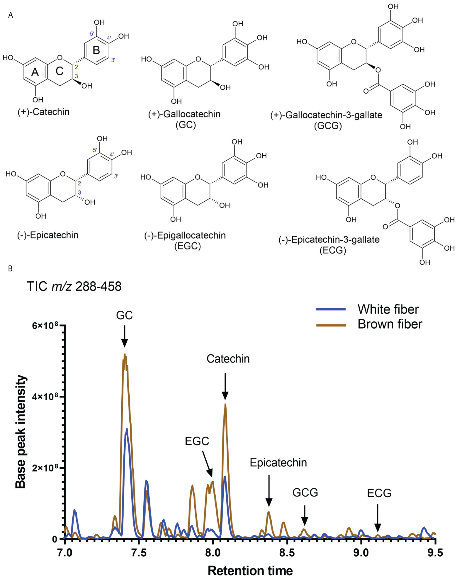 Substantial carbon flux from primary metabolism was directed into the PA pathway. Both isoforms of flavan-3-ols, (+)-catechin and (-)-epicatechin, were detected in NBC and white developing and mature fibers. Figure 5A shows the structures of catechins and epicatechins with gallate modifications detected in fibers of both NILs. A representative total ion chromatogram of extract from fibers at 20 DPA reveals that detected catechins are present in brown and white fibers; the relative amount of catechin is multiple times greater than epicatechin and their corresponding gallate modifications (Figure 5B).