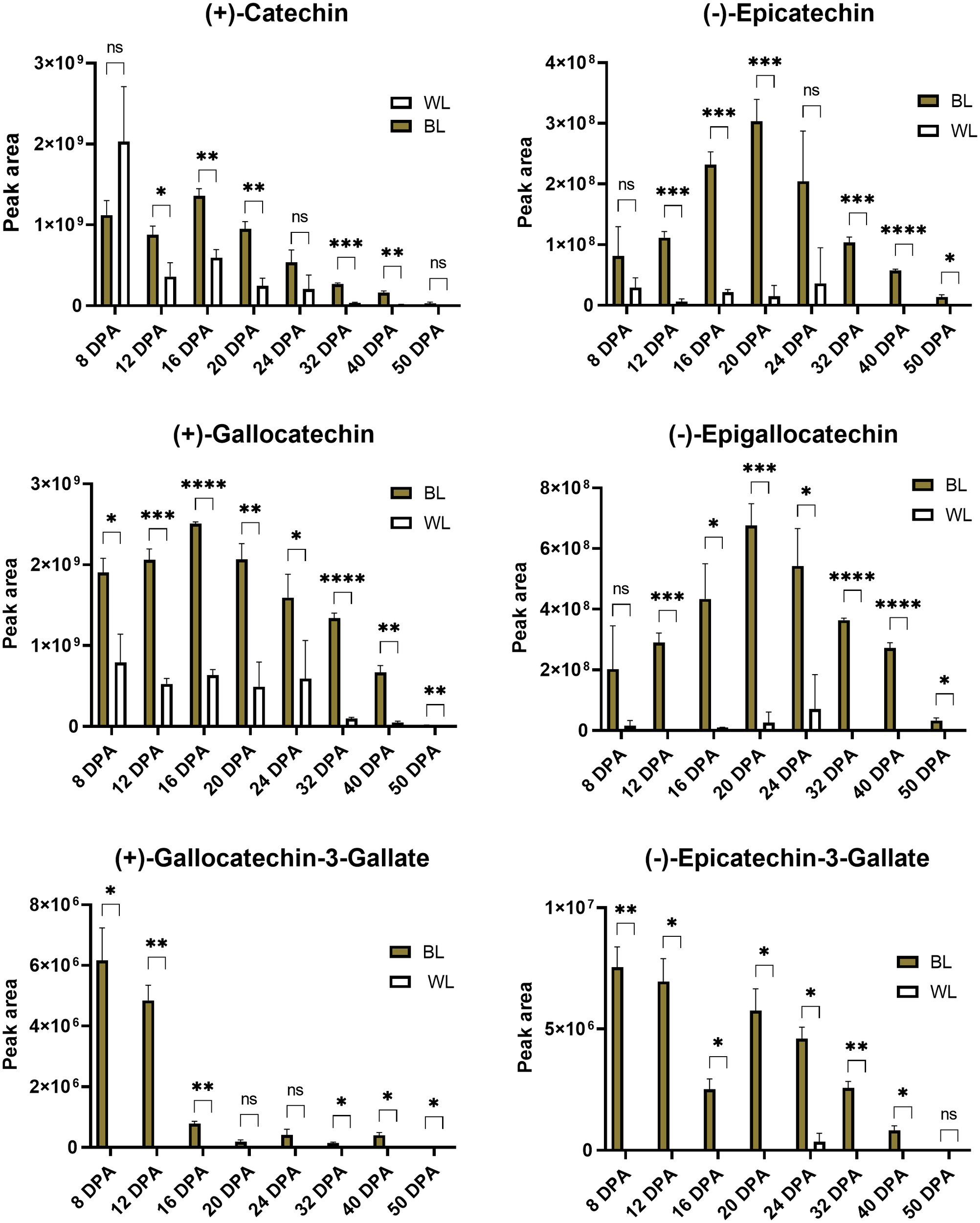 Relative content of catechins based on peak areas in brown and white cotton fibers. Error bars represent standard deviations from three independent biological samples. Asterisks indicate the level of statistical significance determined by multiple comparisons test (Abdi, 2007). *p-value < 0.05, **p-value < 0.01, ***p-value < 0.001, ****p-value < 0.0001, ns, not significant.
