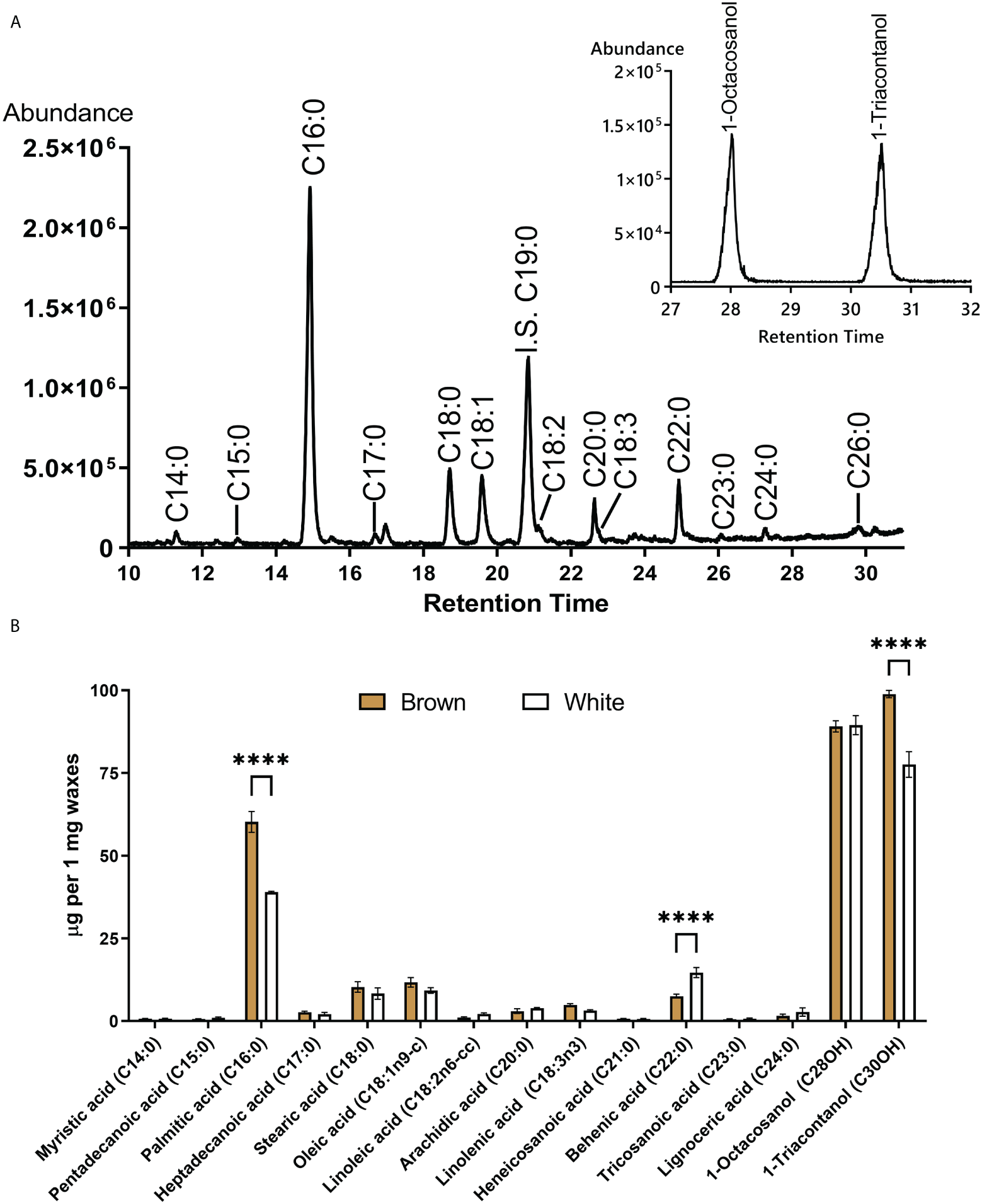 GC-MS of fatty acids and long-chain alcohols from waxes of mature cotton fibers. (A) The central panel shows a total ion chromatogram of ester derivatives of fatty acids (from brown fibers). IS an internal standard. Inset represents the base peak chromatogram (m/z 467 + 495) of TMS derivatives of long-chain alcohols. (B) Waxes composition from mature fiber of brown and white NILs. Asterisks indicate the level of statistical significance determined by the Mixed model with Bonferroni correction (****p-value < 0.0001).