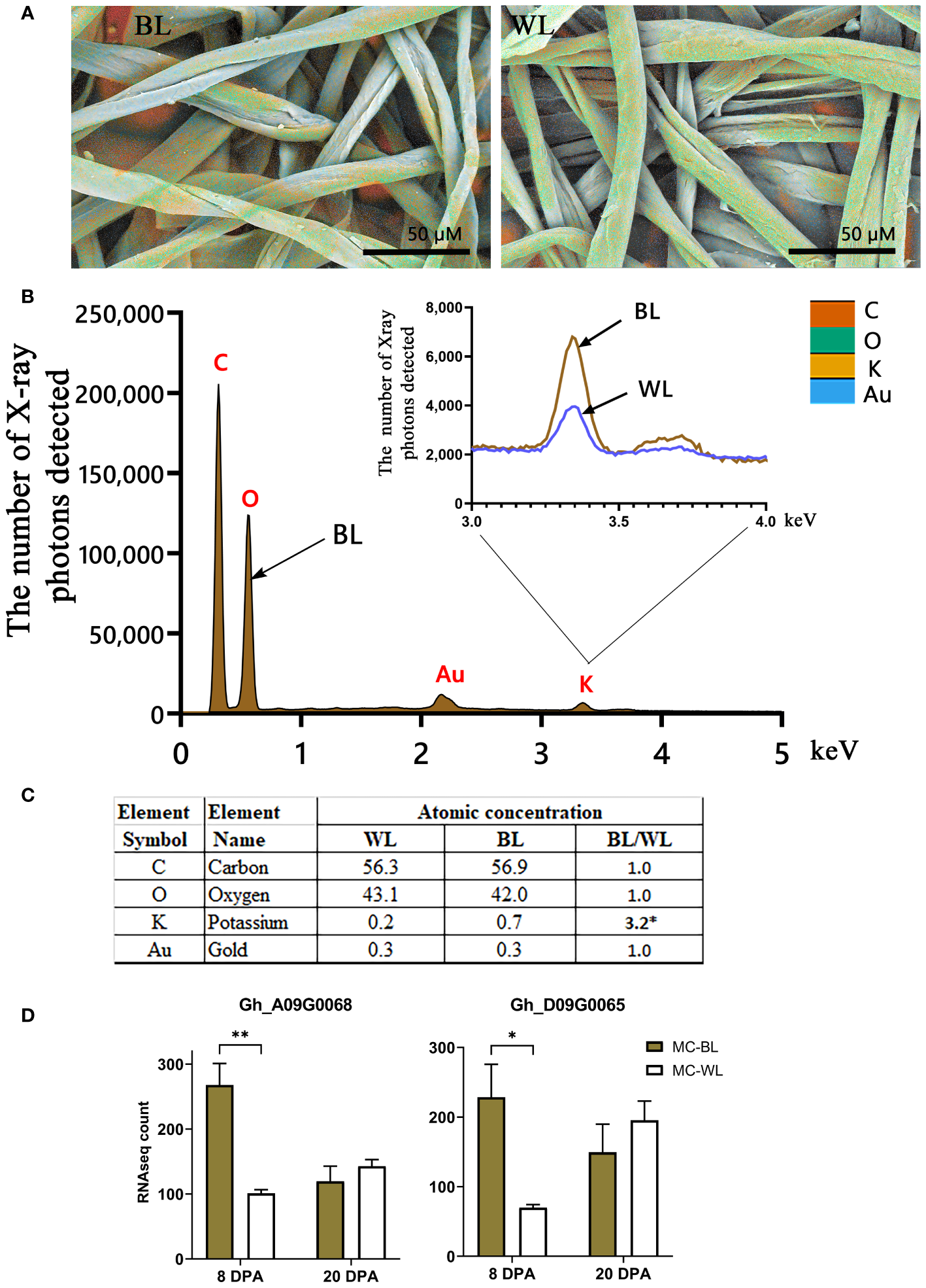 EDS analysis of mature NBC and white fibers. (A) EDS color-coded elemental maps embedded in SEM micrographs of mature brown (BL) and white (WL) fibers of NILs. The color code of detected elements is below, on the right. (B) EDS spectra for BL mature fibers with inset of magnified potassium peaks from BL and WL fibers. Each element symbol is shown on top of the peak. (C) Elemental compositions of BL and WL fibers quantified in atomic percent. The detection limit is approximately 0.1 wt %. The presence of gold resulted from the sputter coating of samples. (D) RNAseq expression of two G hirsutum genes homologous to Arabidopsis TPK3, the two-pore potassium channel. Error bars represent standard deviations from two biological replicates. Asterisks indicate the level of statistical significance determined by multiple comparisons test (Abdi, 2007). *p-value < 0.05, **p-value < 0.01.