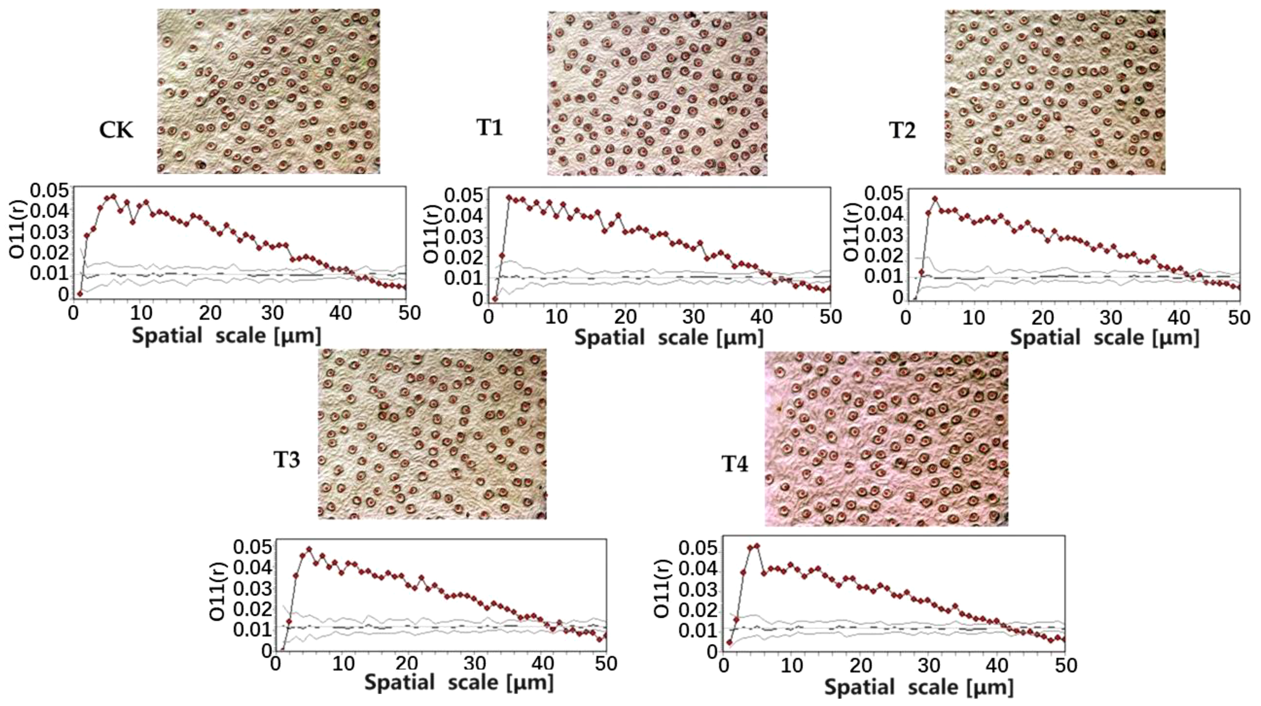 The stomata of E. japonicus were aggregated at the scales of 0 μm~39 μm (CK), 0 μm~40 μm (T1), 0 μm~42 μm (T2), 0 μm~41 μm (T3), and 0 μm~41 μm (T4), respectively. It was randomly distributed at the scales of 39 μm~43 μm (CK), 40 μm~44 μm (T1), 42 μm~45 μm (T2), 41 μm~45 μm (T3), and 41 μm~46 μm (T2). It was uniformly distributed at the scales of 43 μm~100 μm (CK), 44 μm~100 μm (T1), 45 μm~100 μm (T2), 45 μm~100 μm (T3), and 46 μm~100 μm (T4). This showed that the parasitism of C. chinensis affects the spatial distribution pattern of stomata of E. japonicus, which is manifested as follows: with the increase of parasitic intensity, the spatial distribution pattern of stomata of E. japonicus becomes more uniform. Plants adapt to the stress of parasitic plants by adjusting the stomatal distribution pattern of leaves; this may be an ecological strategy adopted by urban greening trees to deal with the parasitism of C. chinensis (Figure 2).