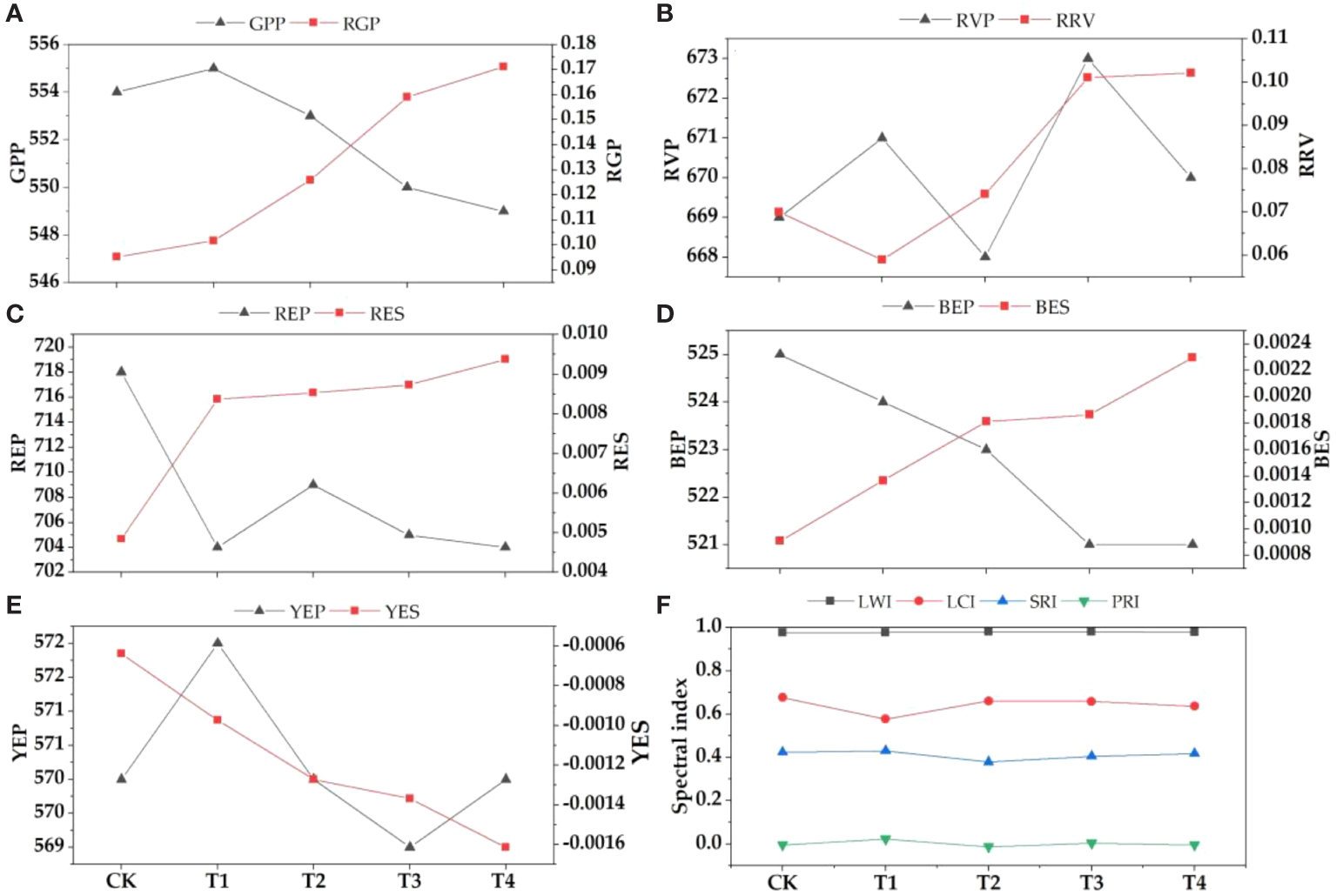 Changes of spectral parameters under different concentrations of parasitism treatment. (A) GPP-green peak position, RGP-reflectance of green peak; (B) RVP, red valley position, RRV-reflectance of red valley; (C) REP-red edge position, RES-red edge slope; (D) BEP-blue edge position, BES-blue edge slope; (E) YEP-yellow edge position, YES-yellow edge slope; (F) LWI-leaf water index, LCI-leaf chlorophyll index, SRI-simple ratio index, PRI-photosyntheticreflectance index.