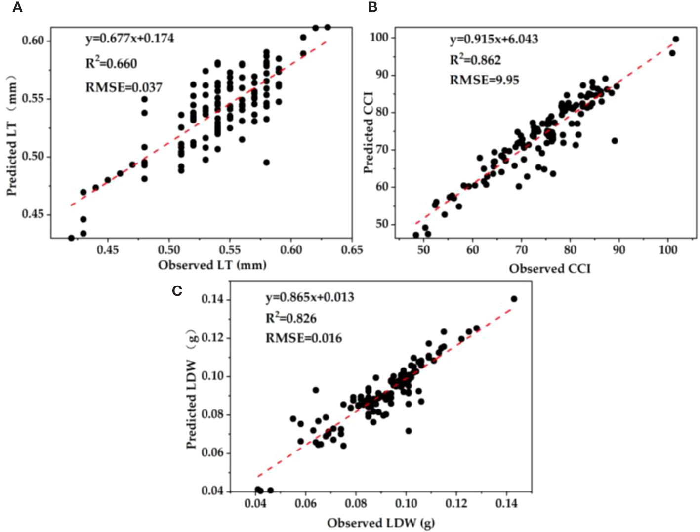 The spectral parameters with good correlation results and leaf functional traits were respectively used to construct a unitary regression model (Table 3). The results showed that the models constructed by leaf chlorophyll index and leaf thickness (R2 = 0.684), photosynthetic reflectance index and chlorophyll content (R2 = 0.862), and reflectance of water stress band and leaf biomass (R2 = 0.826) were the best.