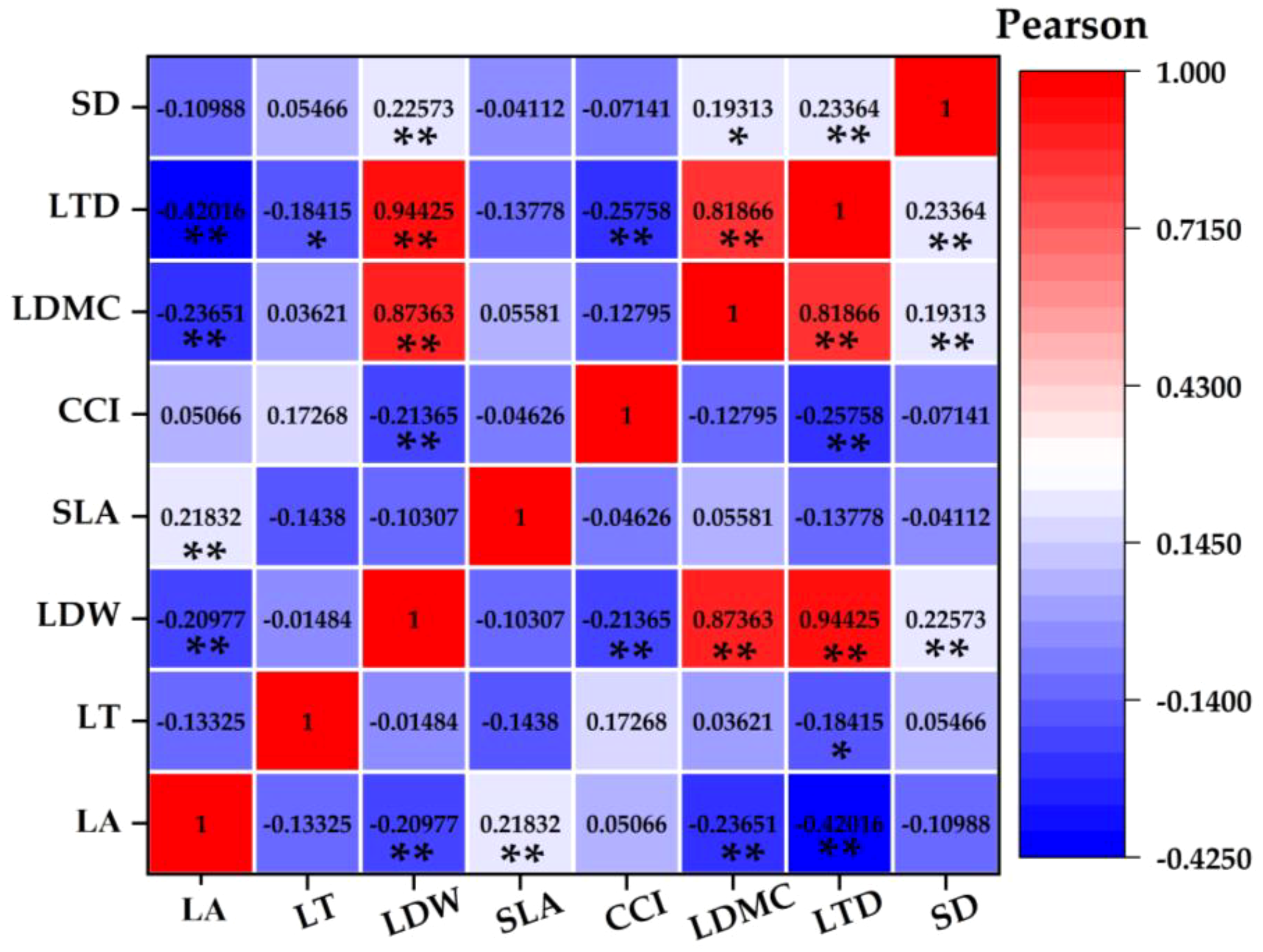 Leaf area was positively correlated with leaf biomass and specific leaf area and negatively correlated with leaf dry matter content and leaf tissue density. Leaf thickness was negatively correlated with leaf dry matter content. Leaf biomass was positively correlated with leaf dry matter content, leaf tissue density, and stomatal density and negatively correlated with chlorophyll content. Chlorophyll content index was negatively correlated with leaf tissue density. The dry matter content of leaves was positively correlated with leaf tissue density and stomatal density. Leaf tissue density was positively correlated with stomatal density.