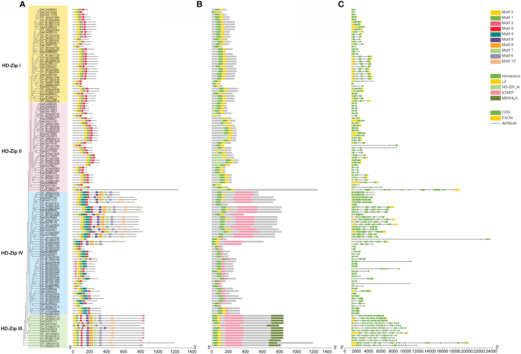 Figure 2 Conserved motifs, conserved domains and gene structure of AcHD-ZIPs. (A) Predicted motifs with phylogenetic tree. (B) Conserved domains. (C) Gene structure of HD-ZIPs, with green blocks, yellow blocks and grey lines representing coding regions (CDS), exons and introns, respectively.
