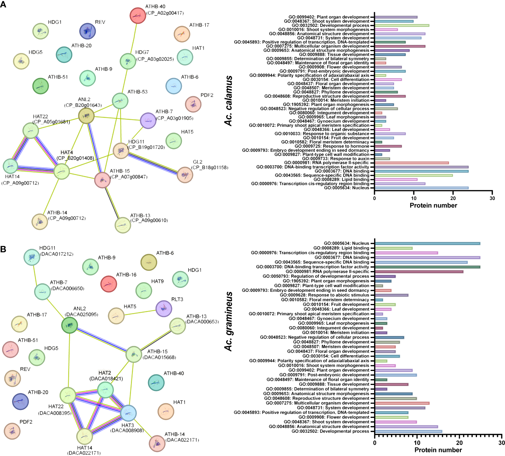 Figure 5 Protein interaction network and GO functions of AcHD-ZIP proteins based on the interactions of their orthologs in Arabidopsis. (A) Protein interaction network of Ac. calamus. (B) Protein interaction network of Ac. gramineus. The nodes represent different proteins, while the color-coded lines indicate various types of evidence for the interactions. Light blue lines, known interactions sourced from curated databases; Red lines, known interactions that have been experimentally determined. Blue lines, predicted interactions based on gene co-occurrence. Black lines, interactions derived from co-expression data. Green lines, interactions identified through text mining.