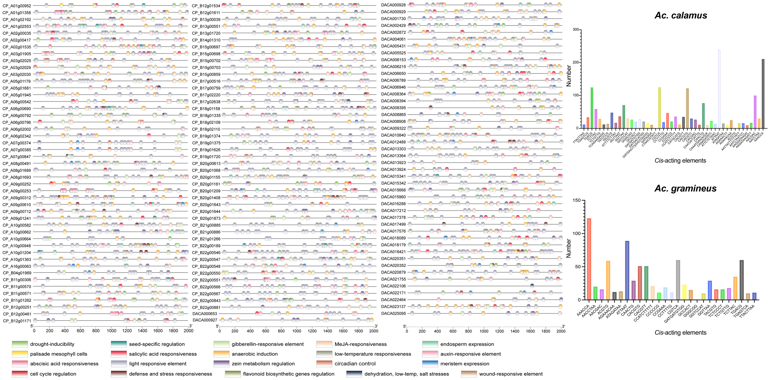 To investigate the regulatory functions of AcHD-ZIPs, we retrieved the 2,000 bp promoter regions of HD-ZIP genes to identify putative cis-acting elements. In total, 2,931 cis-acting elements, comprising 73 types and 20 responsive functions, were identified for both Ac. gramineus and Ac. calamus (Figure 6; Supplementary Table 5). The most abundant elements in Ac. gramineus and Ac. calamus were AAACCA (14.52%) and ATTAAT (11.52%), respectively (Figure 6; Supplementary Table 6). The identified cis-acting elements displayed various functions, including phytohormone responsiveness (gibberellin, auxin, methyl jasmonate (MeJA), salicylic acid, and ABA), stress responsiveness (drought, anoxic, wound, anaerobic, defense, dehydration, low-temperature, and salt). These elements are also associated with plant growth and development, such as light response, cell cycle regulation, and circadian control (Figure 6). Elements associated with light responsiveness are the most prevalent and distributed across all AcHD-ZIPs. Each HD-ZIP gene harbors multiple types of these elements, supporting the key roles of HD-ZIP in modulating the phytohormone network and facilitating plant growth adaptation to environmental stimuli (Figure 6).
