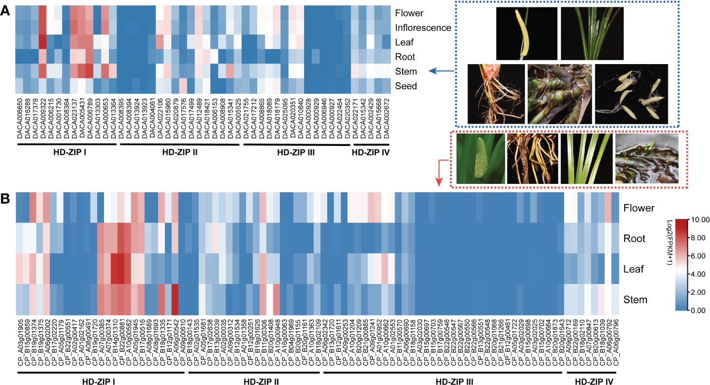 Figure 7 The expression profile of HD-ZIP genes among different tissues based on transcriptomic data. (A) Ac. gramineus. (B) Ac. calamus..