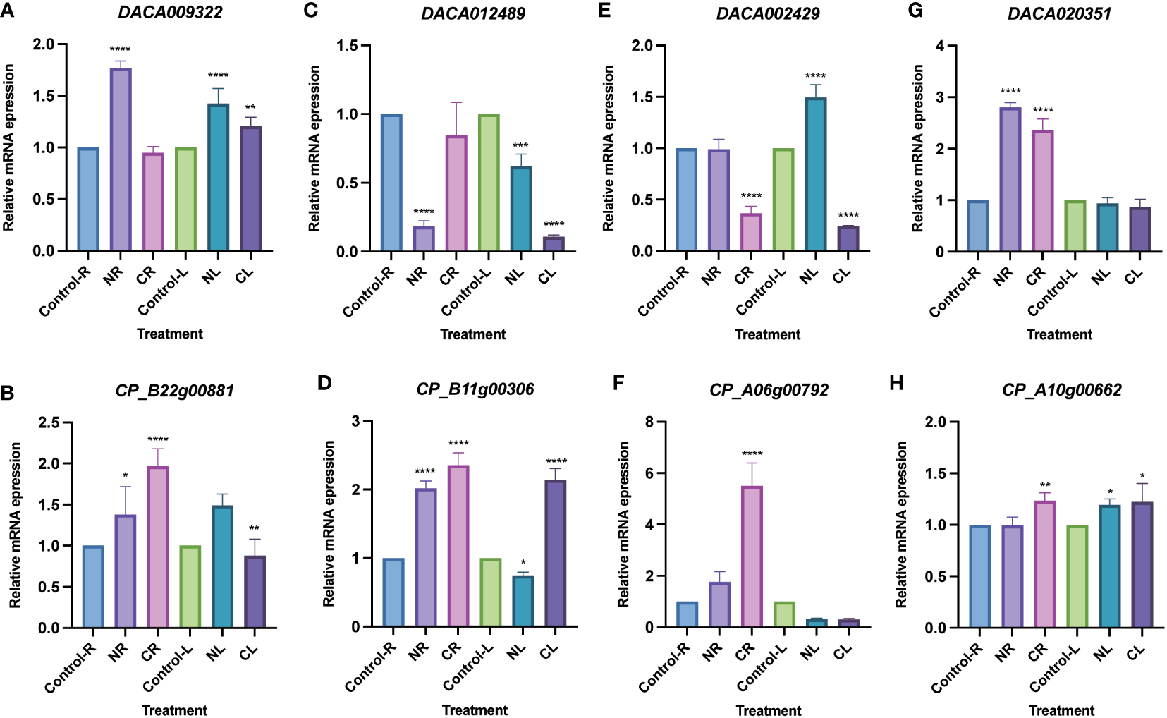 Figure 8 Expression profiles of AcHD-ZIP genes in leaves and roots under different abiotic stress treatments by qRT-PCR. (A) HD-ZIP I gene of Ac. gramineus. (B) HD-ZIP I gene of Ac. calamus. (C) HD-ZIP II gene of Ac. gramineus. (D) HD-ZIP II gene of Ac. calamus. (E) HD-ZIP III gene of Ac. gramineus. (F) HD-ZIP III gene of Ac. calamus. (G) HD-ZIP IV gene of Ac. gramineus. (H) HD-ZIP IV gene of Ac. calamus. Control-R and Control-L designate roots and leaves without stress treatment. NR and NL indicate roots and leaves subjected to treatment with a 200 mM NaCl solution. CR and CL represent roots and leaves exposed to a temperature treatment of 4°C. ANOVA multiple comparison test was performed with star marks *, **, *** and **** representing adjusted P<0.05, P<0.01, P<0.001 and P<0.0001, respectively (Supplementary Table 7).